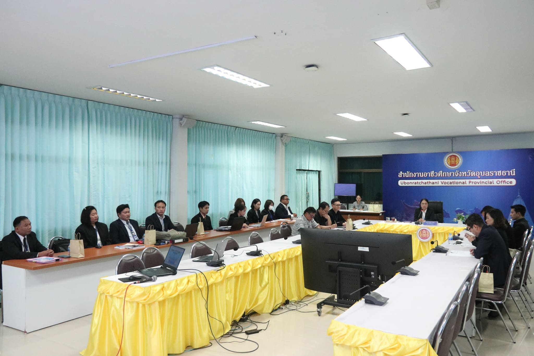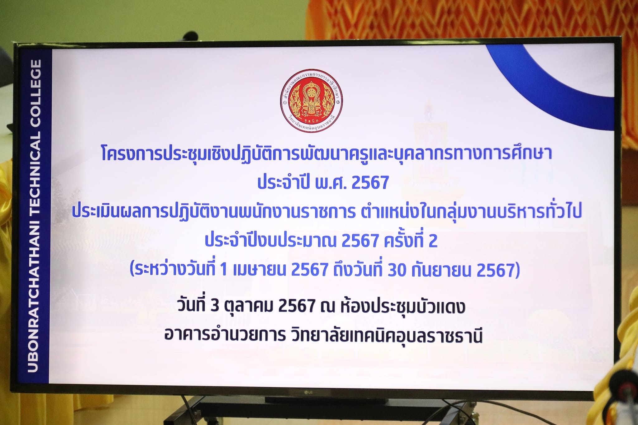 วันที่ ๓ ตุลาคม ๒๕๖๗ เวลา ๐๘.๓๐ น. นายธาตรี พิบูลมณฑา ผู้อำนวยการวิทยาลัยเทคนิคอุบลราชธานี มอบหมายให้ นางสาวสายฝน สาระผลรองผู้อำนวยการ ฝ่ายบริหารทรัพยากรเป็นประธานในการประเมินผลการปฏิบัติงานพนักงานราชการ ตำแหน่งในกลุ่มงานบริหารทั่วไป ประจำปีงบประมาณ พ.ศ. ๒๕๖๗ ครั้งที่ ๒ ภายใต้โครงการประชุมเชิงปฏิบัติการพัฒนาครูและบุคลากรทางการศึกษา ประจำปี พ.ศ. ๒๕๖๗ ณ ห้องประชุมบัวแดง วิทยาลัยเทคนิคอุบลราชธานี โดยมี นายภัทรศักดิ์ ภัทรธรรมพิบูล หัวหน้างานบุคลากร พร้อมด้วยคณะกรรมการประเมิน เข้าร่วมการประเมินผลการปฏิบัติงานของพนักงานราชการอย่างพร้อมเพรียง ทั้งนี้เพื่อให้การปฏิบัติราชการเป็นไปอย่างมีประสิทธิภาพต่อไป