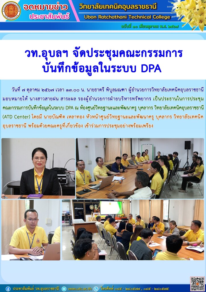 วันที่ ๗ ตุลาคม ๒๕๖๗ เวลา ๑๓.๐๐ น. นายธาตรี พิบูลมณฑา ผู้อำนวยการวิทยาลัยเทคนิคอุบลราชธานี มอบหมายให้ นางสาวสายฝน สาระผล รองผู้อำนวยการฝ่ายบริหารทรัพยากร เป็นประธานในการประชุมคณะกรรมการบันทึกข้อมูลในระบบ DPA ณ ห้องศูนย์วิทยฐานะและพัฒนาครู บุคลากร วิทยาลัยเทคนิคอุบลราชธานี(ATD Center) โดยมี นายบัณฑิต เหลาทอง หัวหน้าศูนย์วิทยฐานะและพัฒนาครู บุคลากร วิทยาลัยเทคนิคอุบลราชธานี พร้อมด้วยคณะครูที่เกี่ยวข้อง เข้าร่วมการประชุมอย่างพร้อมเพรียง