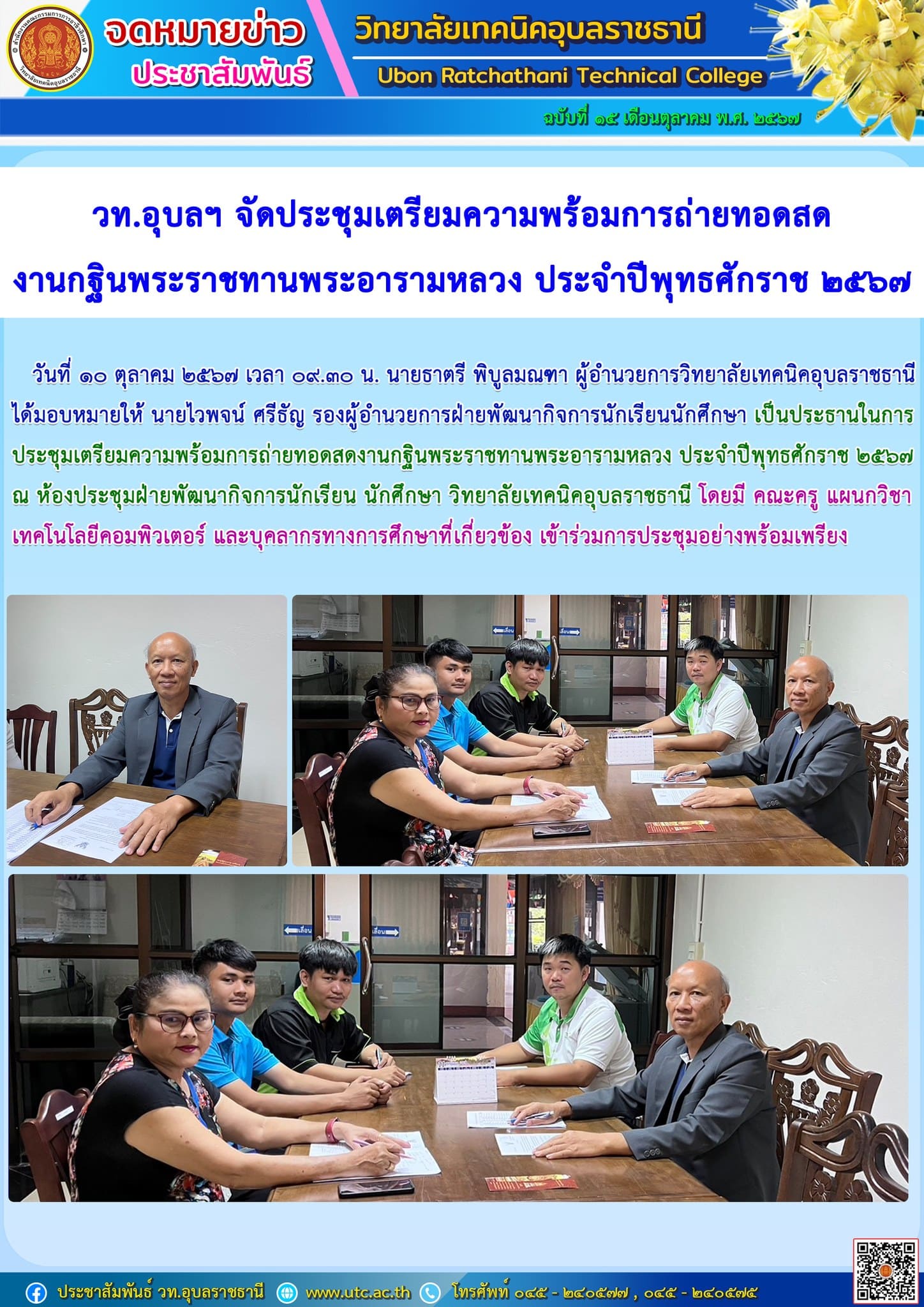 วันที่ ๑๐ ตุลาคม ๒๕๖๗ เวลา ๐๙.๓๐ น. นายธาตรี พิบูลมณฑา ผู้อำนวยการวิทยาลัยเทคนิคอุบลราชธานีได้มอบหมายให้ นายไวพจน์ ศรีธัญ รองผู้อำนวยการฝ่ายพัฒนากิจการนักเรียนนักศึกษา เป็นประธานในการประชุมเตรียมความพร้อมการถ่ายทอดสดงานกฐินพระราชทานพระอารามหลวง ประจำปีพุทธศักราช ๒๕๖๗ณ ห้องประชุมฝ่ายพัฒนากิจการนักเรียน นักศึกษา วิทยาลัยเทคนิคอุบลราชธานี โดยมี คณะครู แผนกวิชาเทคโนโลยีคอมพิวเตอร์ และบุคลากรทางการศึกษาที่เกี่ยวข้อง เข้าร่วมการประชุมอย่างพร้อมเพรียง