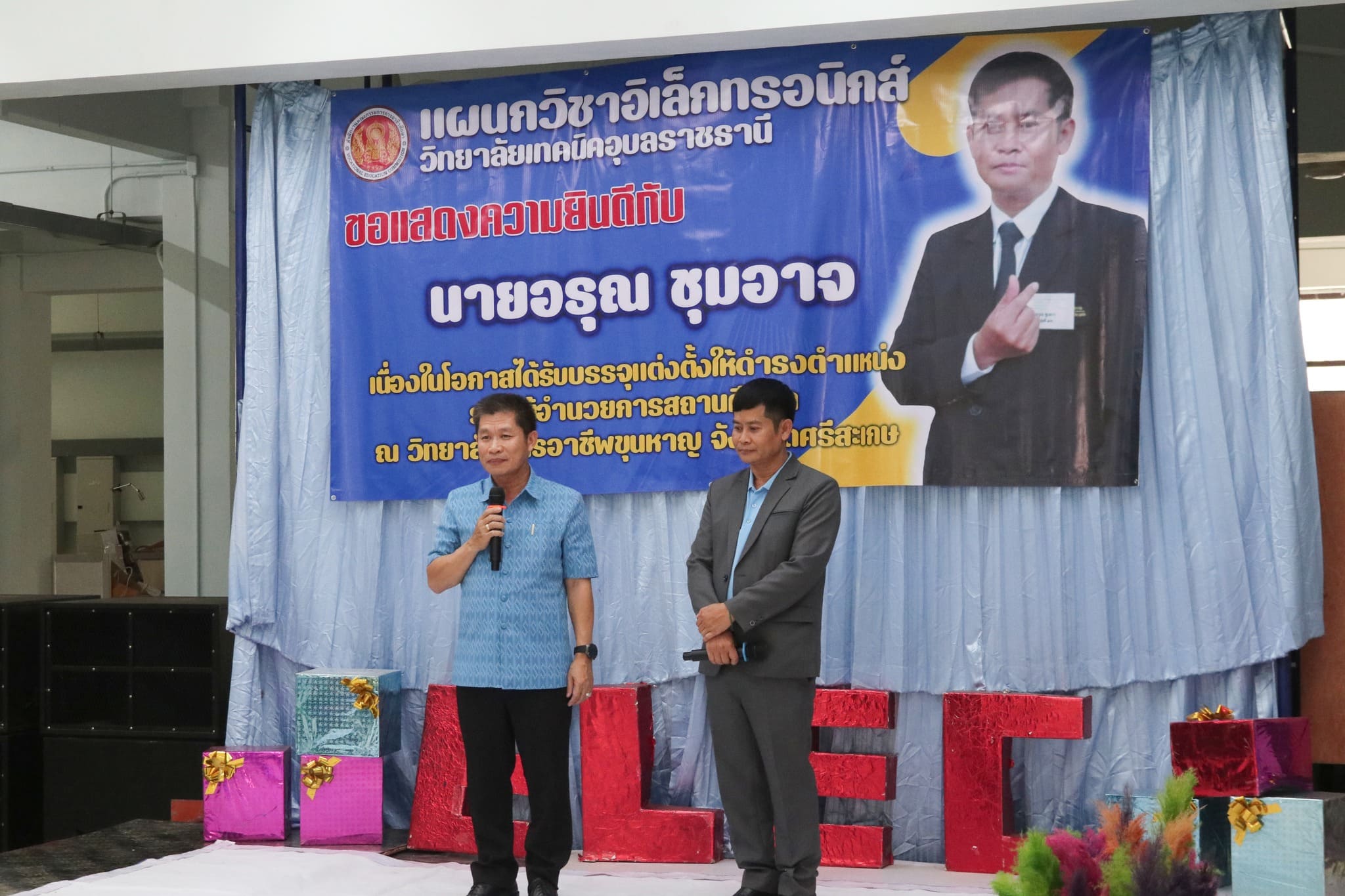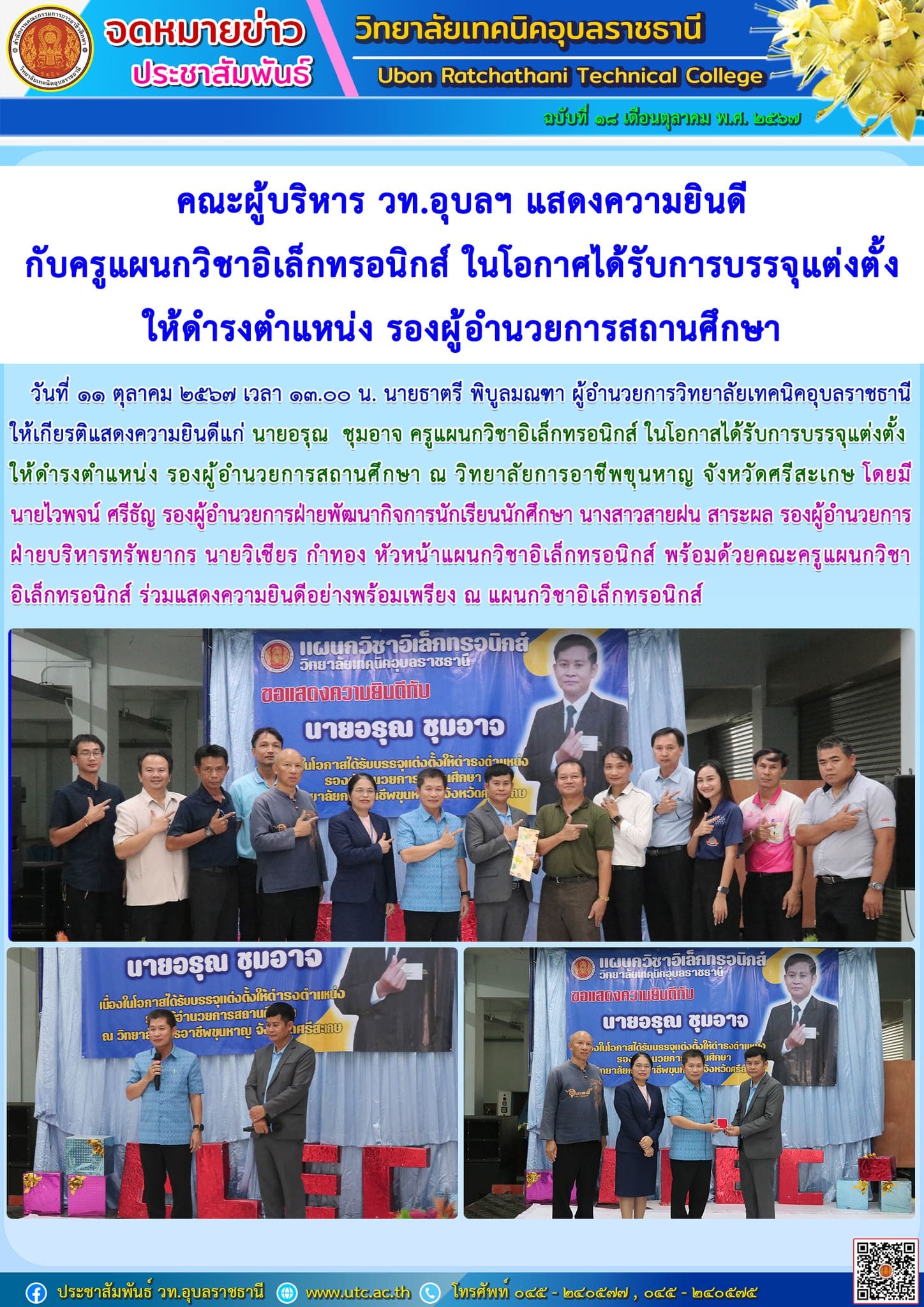 วันที่ ๑๑ ตุลาคม ๒๕๖๗ เวลา ๑๓.๐๐ น. นายธาตรี พิบูลมณฑา ผู้อำนวยการวิทยาลัยเทคนิคอุบลราชธานี ให้เกียรติแสดงความยินดีแก่ นายอรุณ ชุมอาจ ครูแผนกวิชาอิเล็กทรอนิกส์ ในโอกาสได้รับการบรรจุแต่งตั้งให้ดำรงตำแหน่ง รองผู้อำนวยการสถานศึกษา ณ วิทยาลัยการอาชีพขุนหาญ จังหวัดศรีสะเกษ โดยมีนายไวพจน์ ศรีธัญ รองผู้อำนวยการฝ่ายพัฒนากิจการนักเรียนนักศึกษา นางสาวสายฝน สาระผล รองผู้อำนวยการฝ่ายบริหารทรัพยากร นายวิเชียร กำทอง หัวหน้าแผนกวิชาอิเล็กทรอนิกส์ พร้อมด้วยคณะครูแผนกวิชาอิเล็กทรอนิกส์ ร่วมแสดงความยินดีอย่างพร้อมเพรียง ณ แผนกวิชาอิเล็กทรอนิกส์