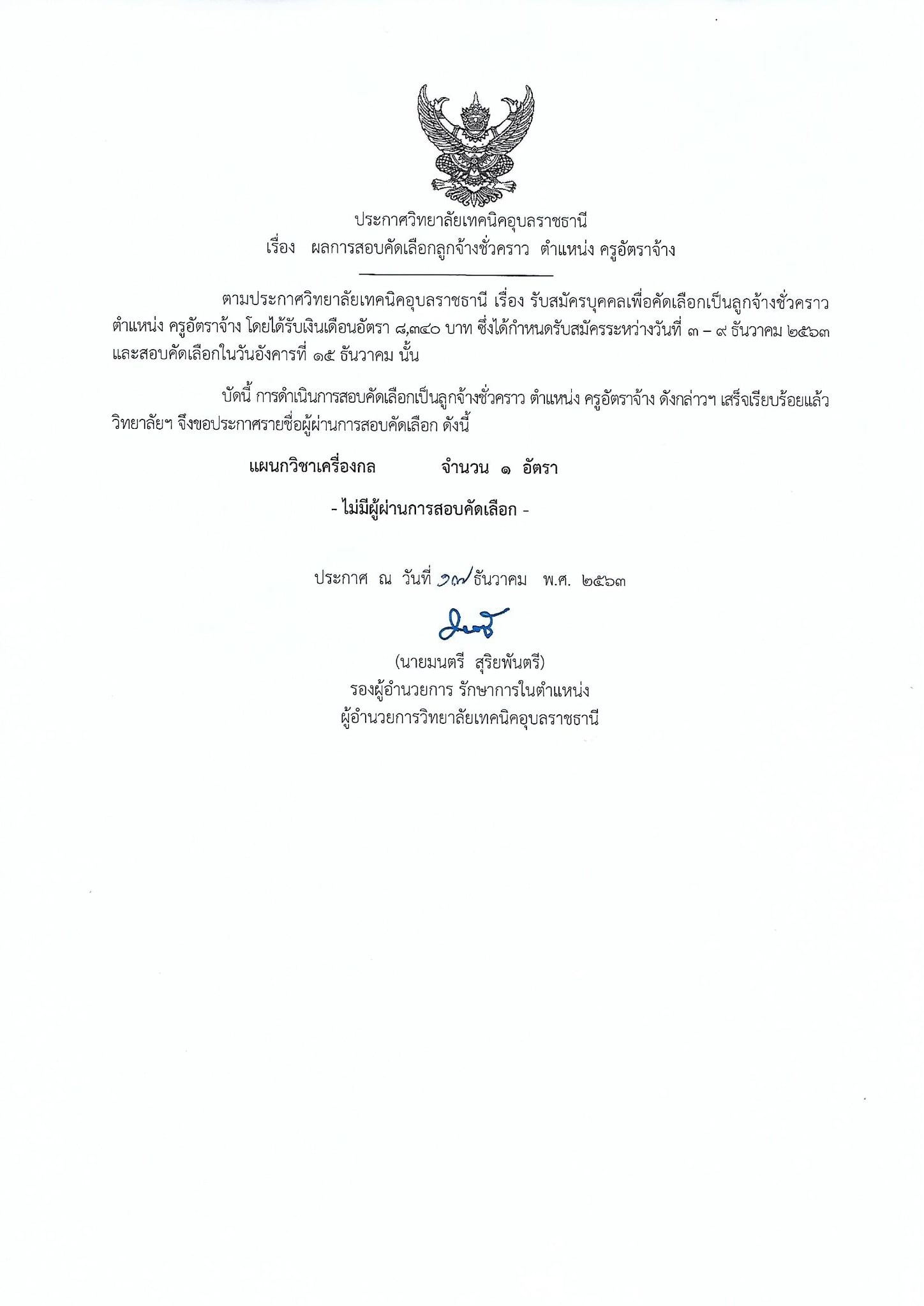 ประกาศผลการสอบลูกจ้างชั่วคราว ตำแหน่งครูอัตราจ้าง แผนกวิชาเครื่องกล