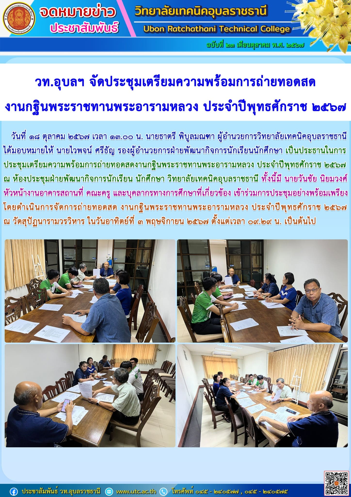 วันที่ ๑๘ ตุลาคม ๒๕๖๗ เวลา ๑๓.๐๐ น. นายธาตรี พิบูลมณฑา ผู้อำนวยการวิทยาลัยเทคนิคอุบลราชธานีได้มอบหมายให้ นายไวพจน์ ศรีธัญ รองผู้อำนวยการฝ่ายพัฒนากิจการนักเรียนนักศึกษา เป็นประธานในการประชุมเตรียมความพร้อมการถ่ายทอดสดงานกฐินพระราชทานพระอารามหลวง ประจำปีพุทธศักราช ๒๕๖๗ณ ห้องประชุมฝ่ายพัฒนากิจการนักเรียน นักศึกษา วิทยาลัยเทคนิคอุบลราชธานี ทั้งนี้มี นายวันชัย นิยมวงศ์หัวหน้างานอาคารสถานที่ คณะครู และบุคลากรทางการศึกษาที่เกี่ยวข้อง เข้าร่วมการประชุมอย่างพร้อมเพรียงโดยดำเนินการจัดการถ่ายทอดสด งานกฐินพระราชทานพระอารามหลวง ประจำปีพุทธศักราช ๒๕๖๗ ณ วัดสุปัฏนารามวรวิหาร ในวันอาทิตย์ที่ ๓ พฤษจิกายน ๒๕๖๗ ตั้งแต่เวลา ๐๙.๒๙ น. เป็นต้นไป