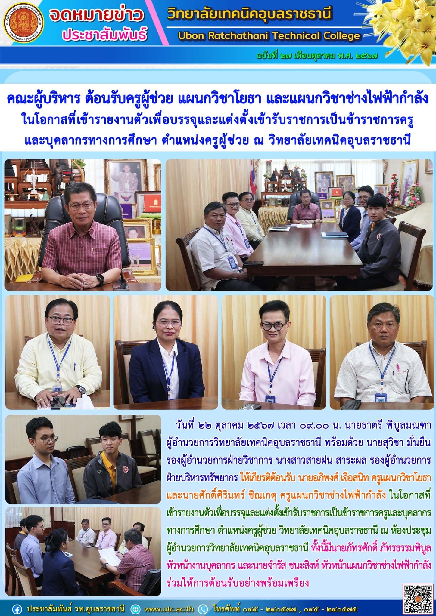 วันที่ ๒๒ ตุลาคม ๒๕๖๗ เวลา ๐๙.๐๐ น. นายธาตรี พิบูลมณฑา ผู้อำนวยการวิทยาลัยเทคนิคอุบลราชธานี พร้อมด้วย นายสุวิชา มั่นยืน รองผู้อำนวยการฝ่ายวิชาการ นางสาวสายฝน สาระผล รองผู้อำนวยการฝ่ายบริหารทรัพยากร ให้เกียรติต้อนรับ นายอภิพงศ์ เจือสนิท ครูแผนกวิชาโยธา และนายศักดิ์ศิรินทร์ ชิณเกตุ ครูแผนกวิชาช่างไฟฟ้ากำลัง ในโอกาสที่เข้ารายงานตัวเพื่อบรรจุและแต่งตั้งเข้ารับราชการเป็นข้าราชการครูและบุคลากรทางการศึกษา ตำแหน่งครูผู้ช่วย วิทยาลัยเทคนิคอุบลราชธานี ณ ห้องประชุมผู้อำนวยการวิทยาลัยเทคนิคอุบลราชธานี ทั้งนี้มีนายภัทรศักดิ์ ภัทรธรรมพิบูล หัวหน้างานบุคลากร และนายจำรัส ชนะสิงห์ หัวหน้าแผนกวิชาช่างไฟฟ้ากำลัง ร่วมให้การต้อนรับอย่างพร้อมเพรียง