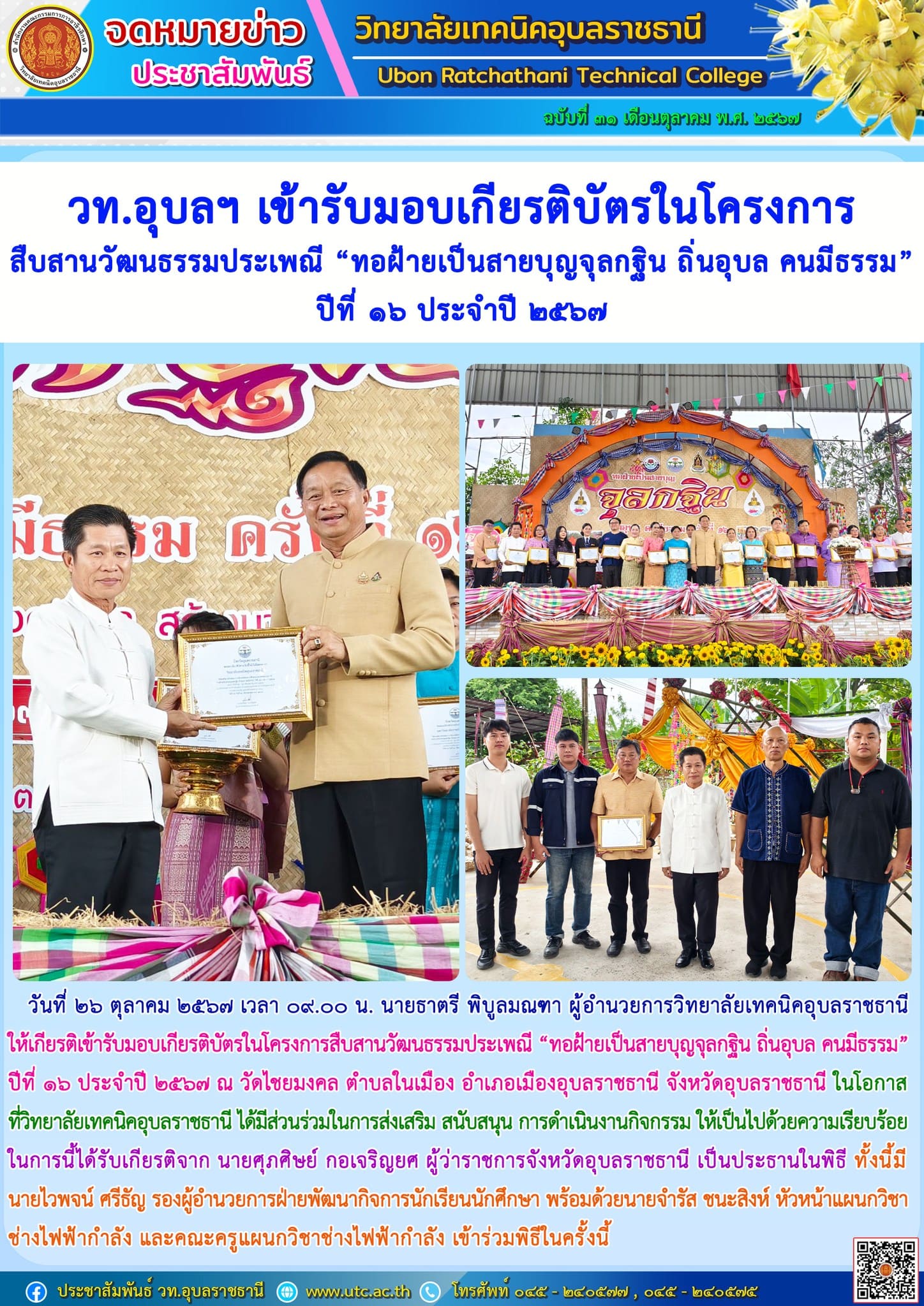 FacebookTwitterLineวันที่ ๖ มีนาคม ๒๕๖๗ เวลา ๐๙ .๐๐ น. นายธาตรี พิบูลมณฑา ผู้อำนวยการวิทยาลัยเทคนิคอุบลราชธานี มอบหมายให้ นายไวพจน์ ศรีธัญ รองผู้อำนวยการฝ่ายพัฒนากิจการนักเรียนนักศึกษา นางสาวสายฝน สาระผล รองผู้อำนวยการฝ่ายบริหารทรัพยากร (เพิ่มเติม…)