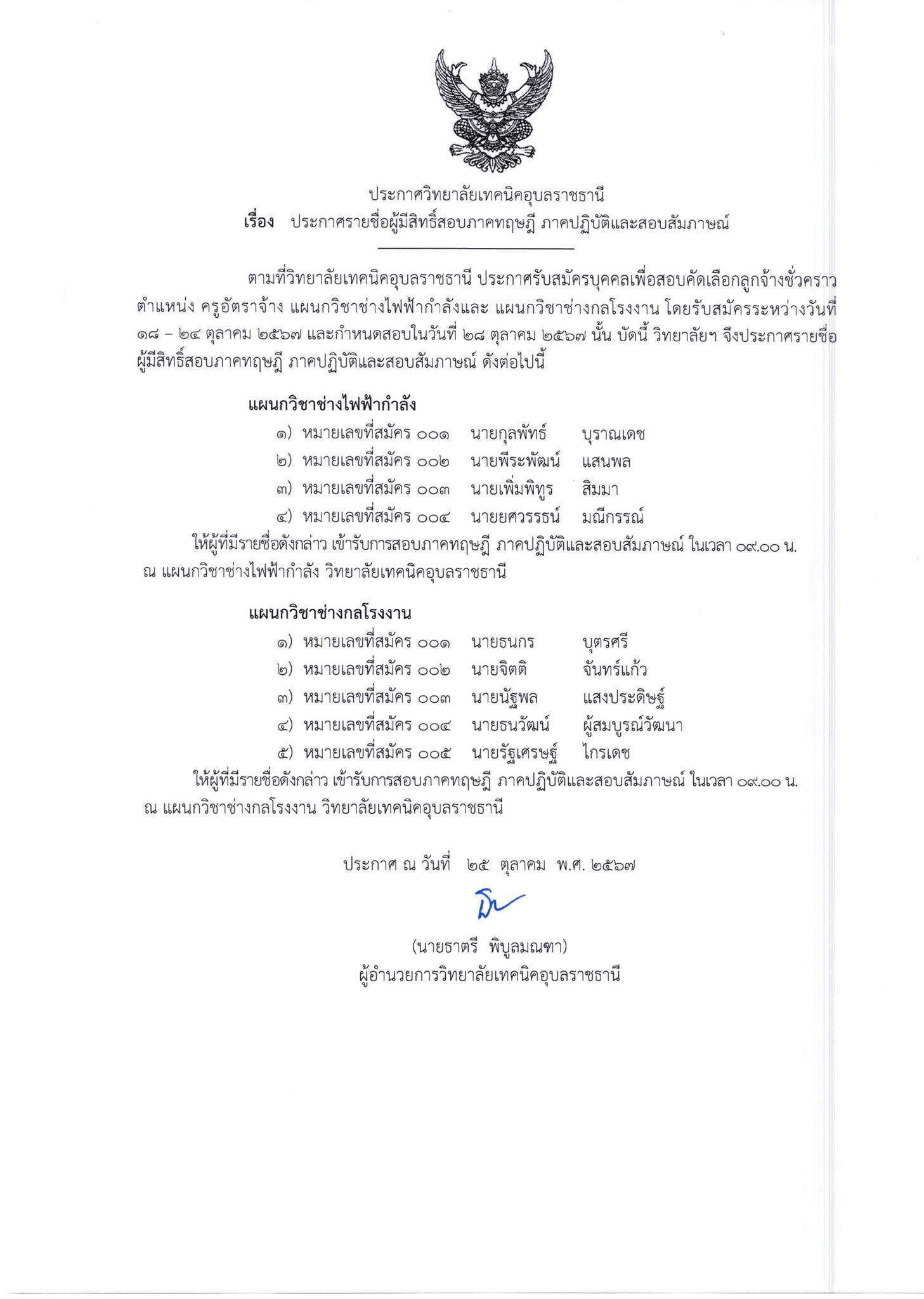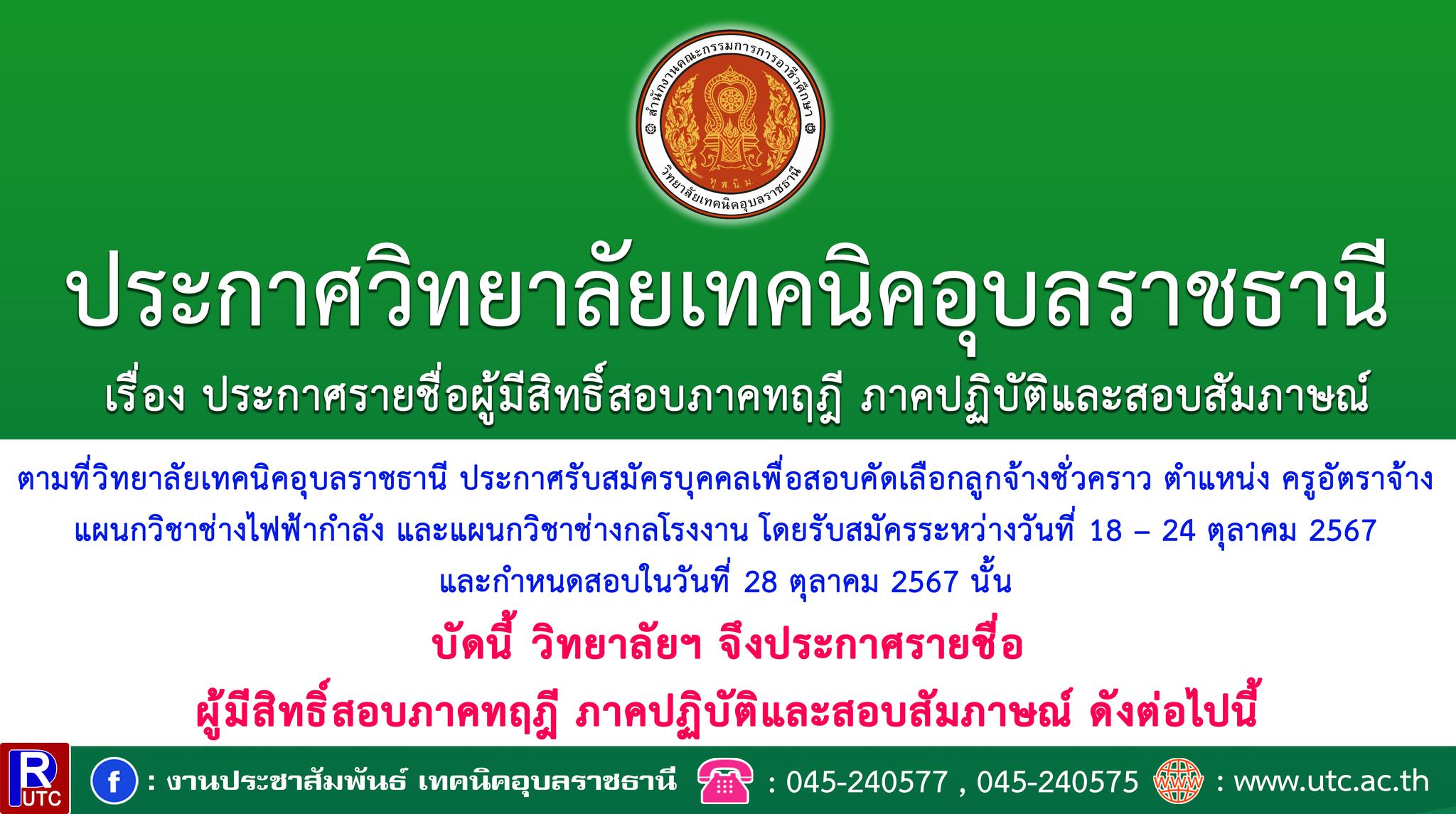 ประกาศรายชื่อผู้มีสิทธิ์สอบภาคทฤฎี ภาคปฏิบัติและสอบสัมภาษณ์ ตามที่วิทยาลัยเทคนิคอุบลราชธานี