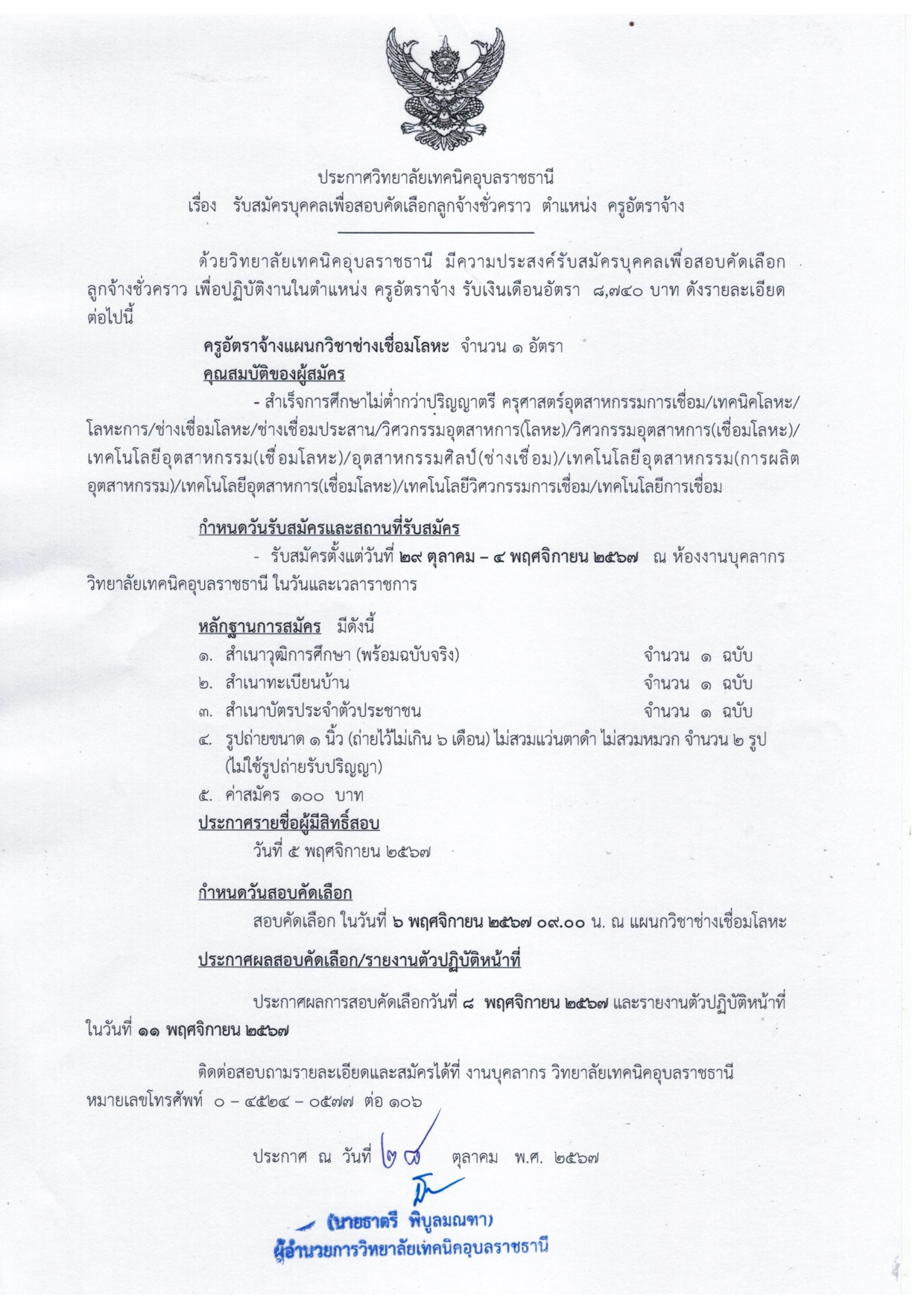 ประกาศวิทยาลัยเทคนิคอุบลราชธานี มีความประสงค์รับสมัครบุคคลเพื่อสอบคัดเลือกลูกจ้างชั่วคราว เพื่อปฏิบัติงานในตำแหน่ง ครูอัตราจ้าง