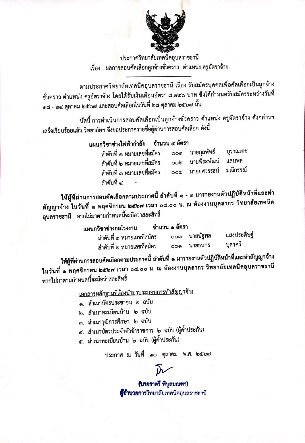 ประกาศ ผลการสอบคัดเลือกลูกจ้างชั่วคราว ตำแหน่ง ครูอัตราจ้าง ตามที่วิทยาลัยเทคนิคอุบลราชธานี แผนกวิชาช่างไฟฟ้าและแผนกวิชาช่างกลโรงงาน