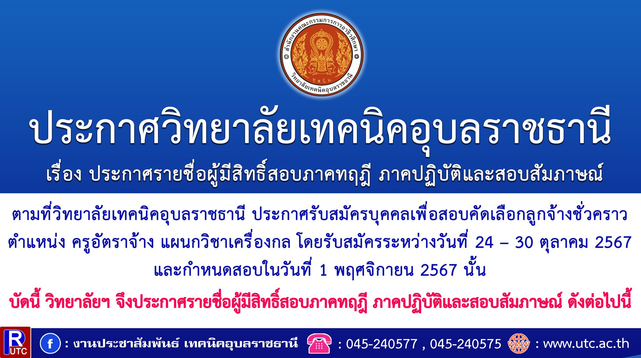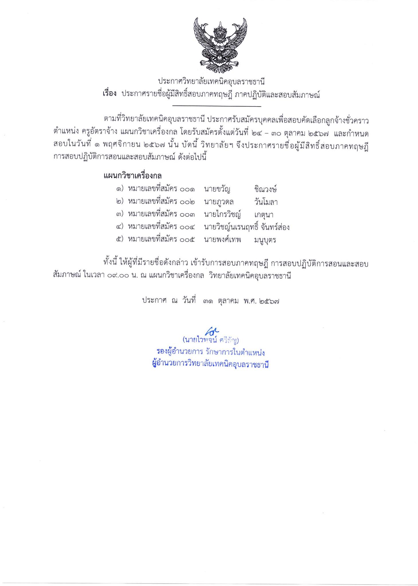 ตามที่วิทยาลัยเทคนิคอุบลราชธานี ประกาศรับสมัครบุคคลเพื่อสอบคัดเลือกลูกจ้างชั่วคราว ตำแหน่ง ครูอัตราจ้าง แผนกวิชาเครื่องกล โดยรับสมัครระหว่างวันที่ 24 – 30 ตุลาคม 2567 และกำหนดสอบในวันที่ 1 พฤศจิกายน 2567 นั้น
