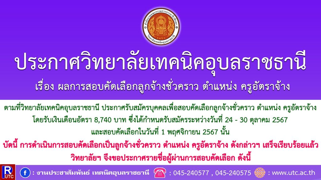 ตามที่วิทยาลัยเทคนิคอุบลราชธานี ประกาศรับสมัครบุคคลเพื่อสอบคัดเลือกลูกจ้างชั่วคราว ตำแหน่ง ครูอัตราจ้าง โดยรับเงินเดือนอัตรา 8,740 บาท ซึ่งได้กำหนดรับสมัครระหว่างวันที่ 24 – 30 ตุลาคม 2567 และสอบคัดเลือกในวันที่ 1 พฤศจิกายน 2567 นั้น