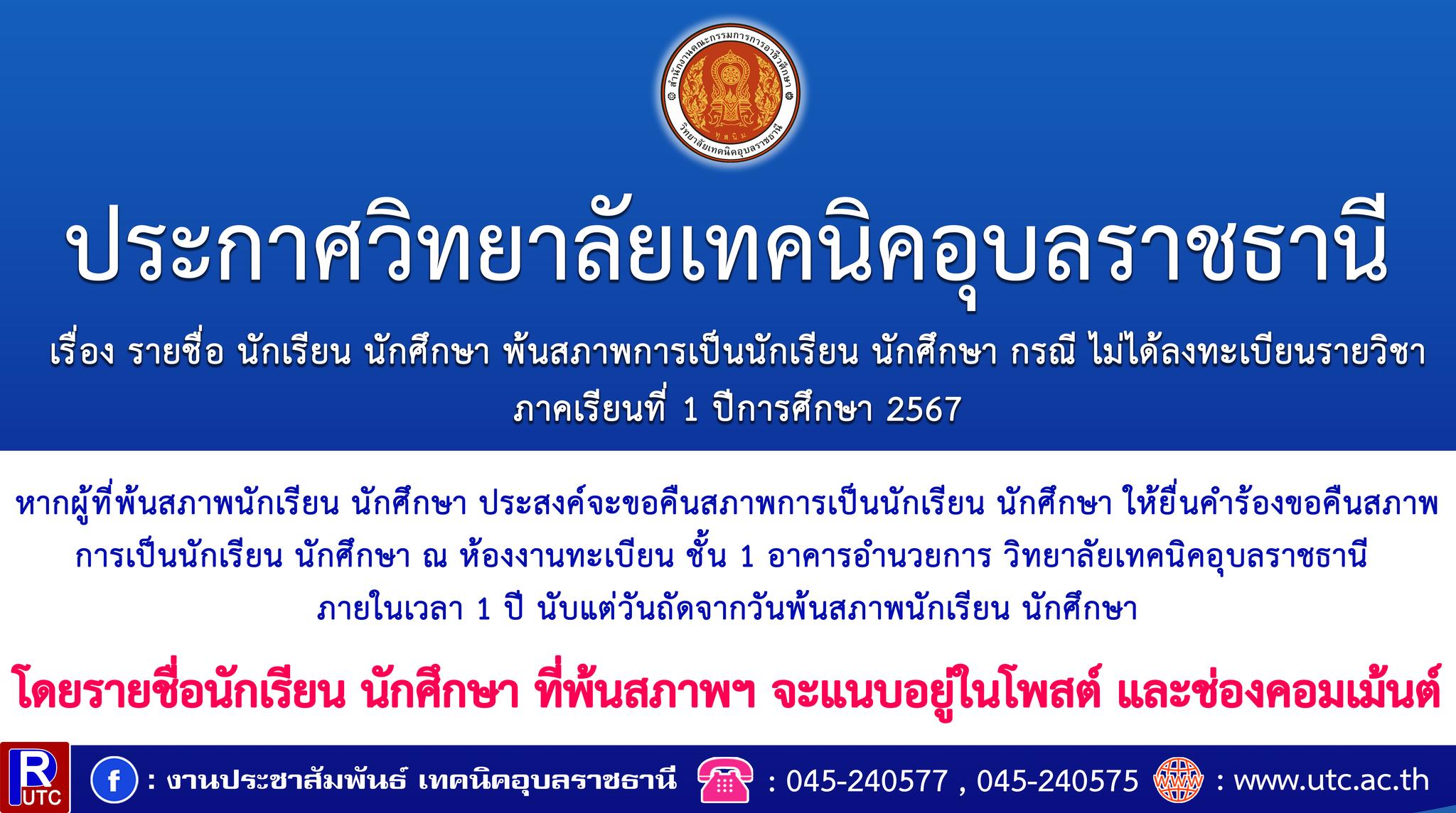 ประกาศ รายชื่อ นักเรียน นักศึกษา พ้นสภาพการเป็นนักเรียน นักศึกษา กรณี ไม่ได้ลงทะเบียนรายวิชา ภาคเรียนที่ 1 ปีการศึกษา 2567