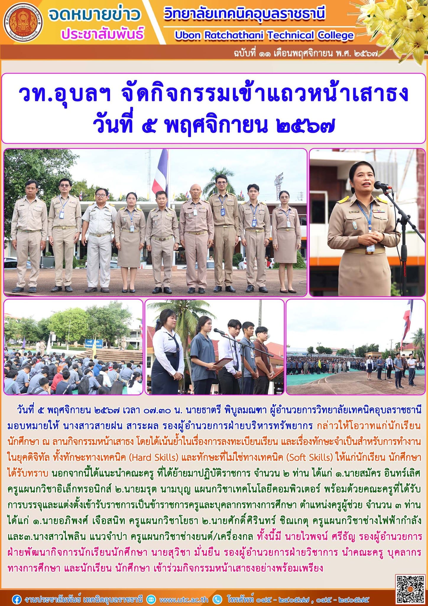 วันที่ ๕ พฤศจิกายน ๒๕๖๗ เวลา ๐๗.๓๐ น. นายธาตรี พิบูลมณฑา ผู้อำนวยการวิทยาลัยเทคนิคอุบลราชธานี มอบหมายให้ นางสาวสายฝน สาระผล รองผู้อำนวยการฝ่ายบริหารทรัพยากร กล่าวให้โอวาทแก่นักเรียน นักศึกษา ณ ลานกิจกรรมหน้าเสาธง โดยได้เน้นย้ำในเรื่องการลงทะเบียนเรียน และเรื่องทักษะจำเป็นสำหรับการทำงานในยุคดิจิทัล ทั้งทักษะทางเทคนิค (Hard Skills) และทักษะที่ไม่ใช่ทางเทคนิค (Soft Skills) ให้แก่นักเรียน นักศึกษาได้รับทราบ นอกจากนี้ได้แนะนำคณะครู ที่ได้ย้ายมาปฏิบัติราชการ จำนวน ๒ ท่าน ได้แก่ ๑.นายสมัคร อินทร์เลิศ