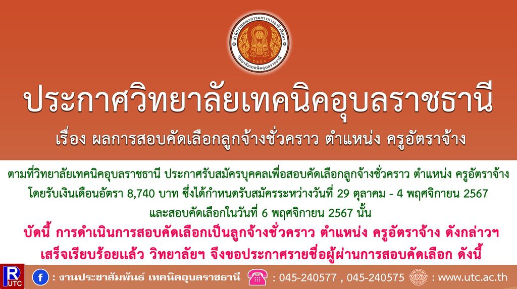 ตามที่วิทยาลัยเทคนิคอุบลราชธานี ประกาศรับสมัครบุคคลเพื่อสอบคัดเลือกลูกจ้างชั่วคราว ตำแหน่ง ครูอัตราจ้าง โดยรับเงินเดือนอัตรา 8,740 บาท ซึ่งได้กำหนดรับสมัครระหว่างวันที่ 29 ตุลาคม – 4 พฤศจิกายน 2567 และสอบคัดเลือกในวันที่ 6 พฤศจิกายน 2567 นั้น