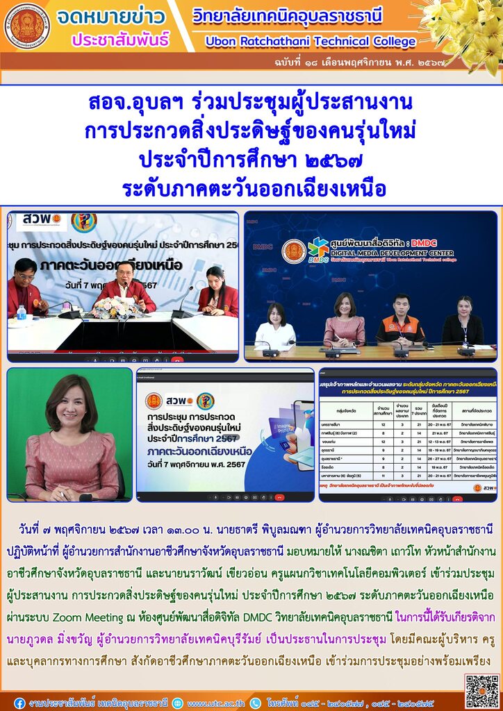 วันที่ ๗ พฤศจิกายน ๒๕๖๗ เวลา ๑๓.๐๐ น. นายธาตรี พิบูลมณฑา ผู้อำนวยการวิทยาลัยเทคนิคอุบลราชธานี ปฏิบัติหน้าที่ ผู้อำนวยการสำนักงานอาชีวศึกษาจังหวัดอุบลราชธานี มอบหมายให้ นางณชิตา เถาว์โท หัวหน้าสำนักงานอาชีวศึกษาจังหวัดอุบลราชธานี และนายนราวัฒน์ เขียวอ่อน ครูแผนกวิชาเทคโนโลยีคอมพิวเตอร์ เข้าร่วมประชุมผู้ประสานงาน การประกวดสิ่งประดิษฐ์ของคนรุ่นใหม่ ประจำปีการศึกษา ๒๕๖๗ ระดับภาคตะวันออกเฉียงเหนือ ผ่านระบบ Zoom Meeting ณ ห้องศูนย์พัฒนาสื่อดิจิทัล DMDC วิทยาลัยเทคนิคอุบลราชธานี ในการนี้ได้รับเกียรติจากนายภูวดล มิ่งขวัญ ผู้อำนวยการวิทยาลัยเทคนิคบุรีรัมย์ เป็นประธานในการประชุม โดยมีคณะผู้บริหาร ครู และบุคลากรทางการศึกษา สังกัดอาชีวศึกษาภาคตะวันออกเฉียงเหนือ เข้าร่วมการประชุมอย่างพร้อมเพรียง