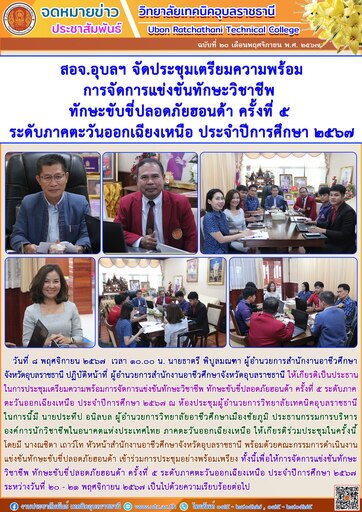 วันที่ ๘ พฤศจิกายน ๒๕๖๗ เวลา ๑๐.๐๐ น. นายธาตรี พิบูลมณฑา ผู้อำนวยการสำนักงานอาชีวศึกษาจังหวัดอุบลราชธานี ปฏิบัติหน้าที่ ผู้อำนวยการสำนักงานอาชีวศึกษาจังหวัดอุบลราชธานี ให้เกียรติเป็นประธานในการประชุมเตรียมความพร้อมการจัดการแข่งขันทักษะวิชาชีพ ทักษะขับขี่ปลอดภัยฮอนด้า ครั้งที่ ๕ ระดับภาคตะวันออกเฉียงเหนือ ประจำปีการศึกษา ๒๕๖๗ ณ ห้องประชุมผู้อำนวยการวิทยาลัยเทคนิคอุบลราชธานี ในการนี้มี นายประทีป อนิลบล ผู้อำนวยการวิทยาลัยอาชีวศึกษาเมืองชัยภูมิ ประธานกรรมการบริหารองค์การนักวิชาชีพในอนาคตแห่งประเทศไทย ภาคตะวันออกเฉียงเหนือ ให้เกียรติร่วมประชุมในครั้งนี้ โดยมี นางณชิตา เถาว์โท หัวหน้าสำนักงานอาชีวศึกษาจังหวัดอุบลราชธานี พร้อมด้วยคณะกรรมการดำเนินงานแข่งขันทักษะขับขี่ปลอดภัยฮอนด้า เข้าร่วมการประชุมอย่างพร้อมเพรียง ทั้งนี้เพื่อให้การจัดการแข่งขันทักษะวิชาชีพ ทักษะขับขี่ปลอดภัยฮอนด้า ครั้งที่ ๕ ระดับภาคตะวันออกเฉียงเหนือ ประจำปีการศึกษา ๒๕๖๗ ระหว่างวันที่ ๒๐ – ๒๑ พฤศจิกายน ๒๕๖๗ เป็นไปด้วยความเรียบร้อยต่อไป