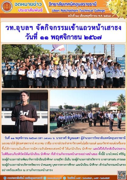 วันที่ ๑๑ พฤศจิกายน ๒๕๖๗ เวลา ๐๗.๓๐ น. นายธาตรี พิบูลมณฑา ผู้อำนวยการวิทยาลัยเทคนิคอุบลราชธานี มอบหมายให้ ผู้ช่วยศาสตราจาย์ ดร.อาคม ปาสีโล อาจารย์ประจำสาขาวิชาเทคโนโลยียานยนต์ แผนกวิชาช่างยนต์/เครื่องกล ขึ้นให้การอบรมในเรื่อง การรมีความรับผิดชอบต่อหน้าที่ ให้แก่นักเรียน นักศึกษา และได้ให้เกียรติเป็นประธานในพิธีมอบเกียรติบัตรให้แก่นักเรียน นักศึกษา ที่เข้าร่วมกิจกรรมหน้าเสาธงอย่างสม่ำเสมอ ทั้งนี้มี นายไวพจน์ ศรีธัญ รองผู้อำนวยการฝ่ายพัฒนากิจการนักเรียนนักศึกษา นายสุวิชา มั่นยืน รองผู้อำนวยการฝ่ายวิชาการ นางสาวสายฝน สาระผล รองผู้อำนวยการฝ่ายบริหารทรัพยากร นำคณะครู บุคลากรทางการศึกษา และนักเรียน นักศึกษา เข้าร่วมกิจกรรมหน้าเสาธงอย่างพร้อมเพรียง ณ ลานกิจกรรมหน้าเสาธง