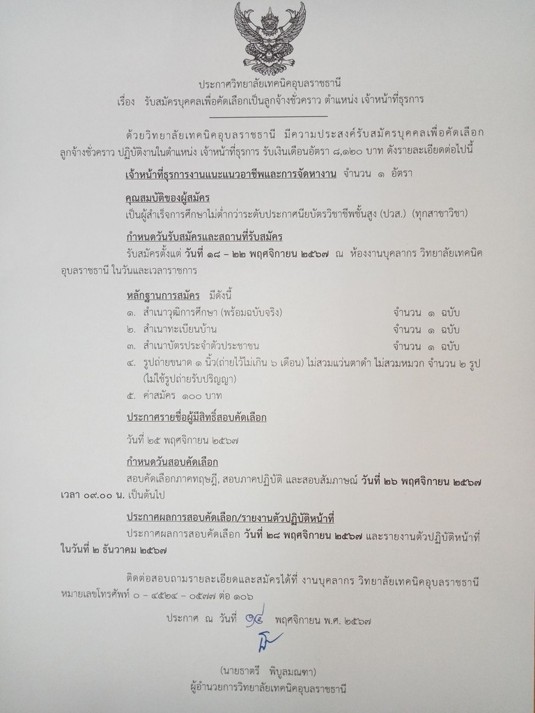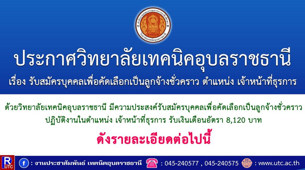 ด้วยวิทยาลัยเทคนิคอุบลราชธานี มีความประสงค์รับสมัครบุคคลเพื่อคัดเลือกเป็นลูกจ้างชั่วคราว ปฏิบัติงานในตำแหน่ง เจ้าหน้าที่ธุรการ รับเงินเดือนอัตรา 8,120 บาท