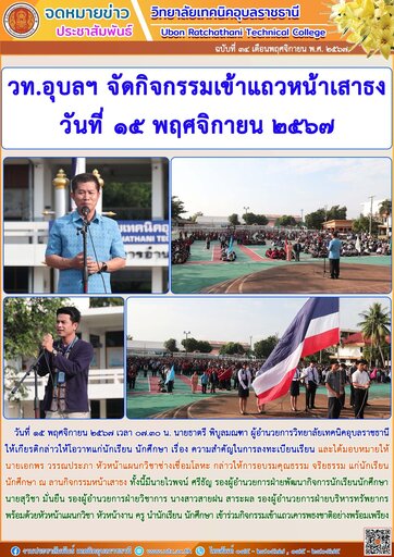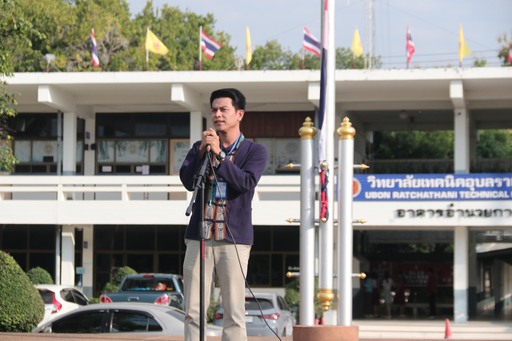 วันที่ ๑๕ พฤศจิกายน ๒๕๖๗ เวลา ๐๗.๓๐ น. นายธาตรี พิบูลมณฑา ผู้อำนวยการวิทยาลัยเทคนิคอุบลราชธานี ให้เกียรติกล่าวให้โอวาทแก่นักเรียน นักศึกษา เรื่อง ความสำคัญในการลงทะเบียนเรียน และได้มอบหมายให้ นายเอกพร วรรณประภา หัวหน้าแผนกวิชาช่างเชื่อมโลหะ กล่าวให้การอบรมคุณธรรม จริยธรรม แก่นักเรียน นักศึกษา ณ ลานกิจกรรมหน้าเสาธง ทั้งนี้มีนายไวพจน์ ศรีธัญ รองผู้อำนวยการฝ่ายพัฒนากิจการนักเรียนนักศึกษา นายสุวิชา มั่นยืน รองผู้อำนวยการฝ่ายวิชาการ นางสาวสายฝน สาระผล รองผู้อำนวยการฝ่ายบริหารทรัพยากร พร้อมด้วยหัวหน้าแผนกวิชา หัวหน้างาน ครู นำนักเรียน นักศึกษา เข้าร่วมกิจกรรมเข้าแถวเคารพธงชาติอย่างพร้อมเพรียง