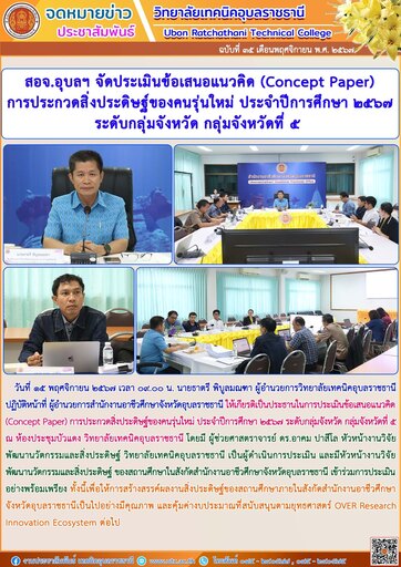 วันที่ ๑๕ พฤศจิกายน ๒๕๖๗ เวลา ๐๙.๐๐ น. นายธาตรี พิบูลมณฑา ผู้อำนวยการวิทยาลัยเทคนิคอุบลราชธานี ปฏิบัติหน้าที่ ผู้อำนวยการสำนักงานอาชีวศึกษาจังหวัดอุบลราชธานี ให้เกียรติเป็นประธานในการประเมินข้อเสนอแนวคิด (Concept Paper) การประกวดสิ่งประดิษฐ์ของคนรุ่นใหม่ ประจำปีการศึกษา ๒๕๖๗ ระดับกลุ่มจังหวัด กลุ่มจังหวัดที่ ๕ ณ ห้องประชุมบัวแดง วิทยาลัยเทคนิคอุบลราชธานี โดยมี ผู้ช่วยศาสตราจารย์ ดร.อาคม ปาสีโล หัวหน้างานวิจัยพัฒนานวัตกรรมและสิ่งประดิษฐ์ วิทยาลัยเทคนิคอุบลราชธานี เป็นผู้ดำเนินการประเมิน และมีหัวหน้างานวิจัยพัฒนานวัตกรรมและสิ่งประดิษฐ์ ของสถานศึกษาในสังกัดสำนักงานอาชีวศึกษาจังหวัดอุบลราชธานี เข้าร่วมการประเมินอย่างพร้อมเพรียง ทั้งนี้เพื่อให้การสร้างสรรค์ผลงานสิ่งประดิษฐ์ของสถานศึกษาภายในสังกัดสำนักงานอาชีวศึกษาจังหวัดอุบลราชธานีเป็นไปอย่างมีคุณภาพ และคุ้มค่างบประมาณที่สนับสนุนตามยุทธศาสตร์ OVER Research Innovation Ecosystem ต่อไป