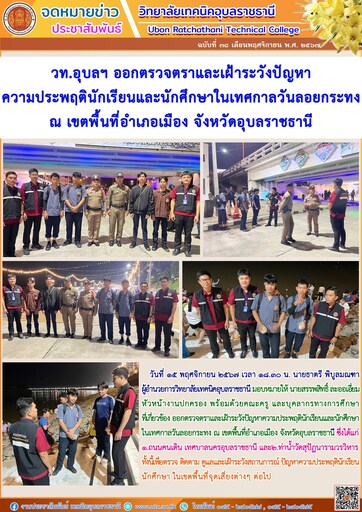 วันที่ ๑๕ พฤศจิกายน ๒๕๖๗ เวลา ๑๘.๓๐ น. นายธาตรี พิบูลมณฑา ผู้อำนวยการวิทยาลัยเทคนิคอุบลราชธานี มอบหมายให้ นายสรรพสิทธิ์ ละออเอี่ยม หัวหน้างานปกครอง พร้อมด้วยคณะครู และบุคลากรทางการศึกษาที่เกี่ยวข้อง ออกตรวจตราและเฝ้าระวังปัญหาความประพฤตินักเรียนและนักศึกษาในเทศกาลวันลอยกระทง ณ เขตพื้นที่อำเภอเมือง จังหวัดอุบลราชธานี ซึ่งได้แก่ ๑.ถนนคนเดิน เทศบาลนครอุบลราชธานี และ๒.ท่าน้ำวัดสุปัฏนารามวรวิหาร ทั้งนี้เพื่อตรวจ ติดตาม ดูแลและเฝ้าระวังสถานการณ์ ปัญหาความประพฤตินักเรียน นักศึกษาในเขตพื้นที่จุดเสี่ยงต่างๆ ต่อไป