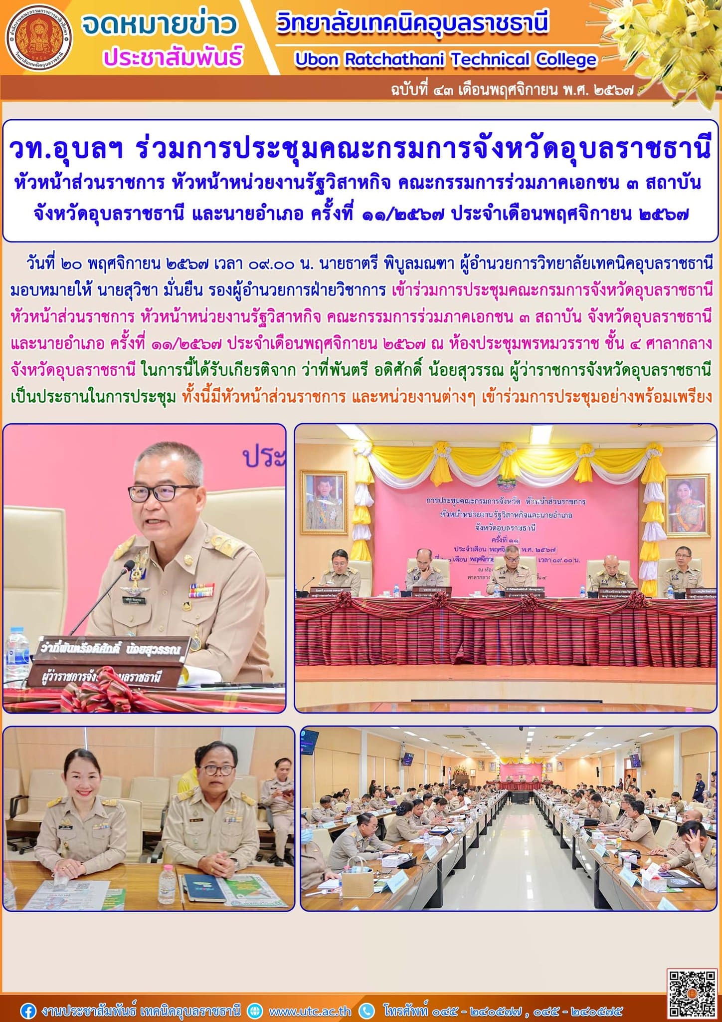 วันที่ ๒๐ พฤศจิกายน ๒๕๖๗ เวลา ๐๙.๐๐ น. นายธาตรี พิบูลมณฑา ผู้อำนวยการวิทยาลัยเทคนิค อุบลราชธานี มอบหมายให้ นายสุวิชา มั่นยืน รองผู้อำนวยการฝ่ายวิชาการ เข้าร่วมการประชุมคณะกรมการจังหวัดอุบลราชธานี หัวหน้าส่วนราชการ หัวหน้าหน่วยงานรัฐวิสาหกิจ คณะกรรมการร่วมภาคเอกชน ๓ สถาบัน จังหวัดอุบลราชธานี และนายอำเภอ ครั้งที่ ๑๑/๒๕๖๗ ประจำเดือนพฤศจิกายน ๒๕๖๗ ณ ห้องประชุมพรหมวรราช ชั้น ๔ ศาลากลางจังหวัดอุบลราชธานี ในการนี้ได้รับเกียรติจาก ว่าที่พันตรี อดิศักดิ์ น้อยสุวรรณ ผู้ว่าราชการจังหวัดอุบลราชธานี เป็นประธานในการประชุม ทั้งนี้มีหัวหน้าส่วนราชการ และหน่วยงานต่างๆ เข้าร่วมการประชุมอย่างพร้อมเพรียง