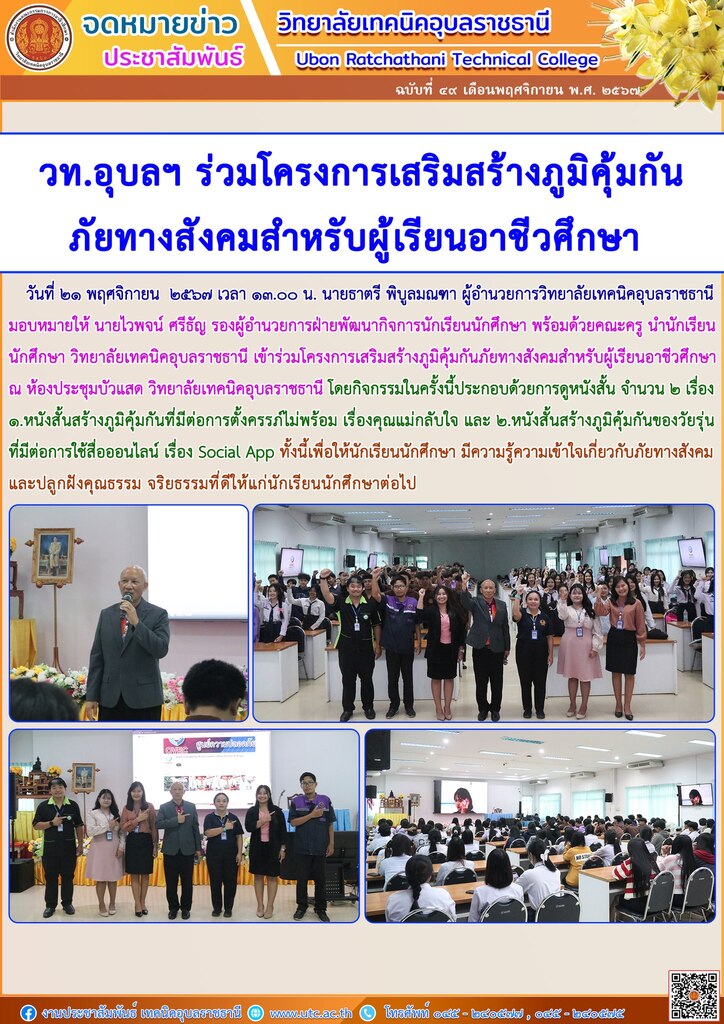 วันที่ ๒๑ พฤศจิกายน ๒๕๖๗ เวลา ๑๓.๐๐ น. นายธาตรี พิบูลมณฑา ผู้อำนวยการวิทยาลัยเทคนิคอุบลราชธานีมอบหมายให้ นายไวพจน์ ศรีธัญ รองผู้อำนวยการฝ่ายพัฒนากิจการนักเรียนนักศึกษา พร้อมด้วยคณะครู นำนักเรียนนักศึกษา วิทยาลัยเทคนิคอุบลราชธานี เข้าร่วมโครงการเสริมสร้างภูมิคุ้มกันภัยทางสังคมสำหรับผู้เรียนอาชีวศึกษา ณ ห้องประชุมบัวแสด วิทยาลัยเทคนิคอุบลราชธานี โดยกิจกรรมในครั้งนี้ประกอบด้วยการดูหนังสั้น จำนวน ๒ เรื่อง๑.หนังสั้นสร้างภูมิคุ้มกันที่มีต่อการตั้งครรภ์ไม่พร้อม เรื่องคุณแม่กลับใจ และ ๒.หนังสั้นสร้างภูมิคุ้มกันของวัยรุ่นที่มีต่อการใช้สื่อออนไลน์ เรื่อง Social App ทั้งนี้เพื่อให้นักเรียนนักศึกษา มีความรู้ความเข้าใจเกี่ยวกับภัยทางสังคมและปลูกฝังคุณธรรม จริยธรรมที่ดีให้แก่นักเรียนนักศึกษาต่อไป