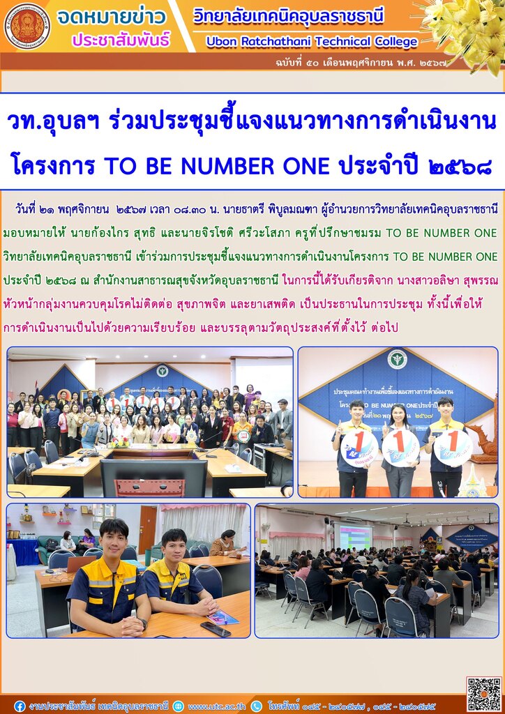 วันที่ ๒๑ พฤศจิกายน ๒๕๖๗ เวลา ๐๘.๓๐ น. นายธาตรี พิบูลมณฑา ผู้อำนวยการวิทยาลัยเทคนิคอุบลราชธานีมอบหมายให้ นายก้องไกร สุทธิ และนายจิรโชติ ศรีวะโสภา ครูที่ปรึกษาชมรม TO BE NUMBER ONE วิทยาลัยเทคนิคอุบลราชธานี เข้าร่วมการประชุมชี้แจงแนวทางการดำเนินงานโครงการ TO BE NUMBER ONEประจำปี ๒๕๖๘ ณ สำนักงานสาธารณสุขจังหวัดอุบลราชธานี ในการนี้ได้รับเกียรติจาก นางสาวอลิษา สุพรรณหัวหน้ากลุ่มงานควบคุมโรคไม่ติดต่อ สุขภาพจิต และยาเสพติด เป็นประธานในการประชุม ทั้งนี้เพื่อให้การดำเนินงานเป็นไปด้วยความเรียบร้อย และบรรลุตามวัตถุประสงค์ที่ตั้งไว้ ต่อไป
