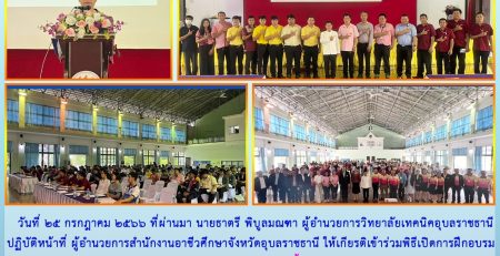 วันที่ ๒๒ พฤศจิกายน ๒๕๖๗ เวลา ๐๗.๓๐ น. นายธาตรี พิบูลมณฑา ผู้อำนวยการวิทยาลัยเทคนิคอุบลราชธานีมอบหมายให้ นายสรรพสิทธิ์ ละออเอี่ยม หัวหน้างานปกครอง อบรมและให้ความรู้เรื่อง ความปลอดภัยในการใช้รถใช้ถนน แก่นักเรียน นักศึกษา ณ ลานกิจกรรมหน้าเสาธง ในการนี้ได้รับเกียรติจาก ร.ต.อ.วรจักร ผลดี รอง สว.จร.ฯและเจ้าหน้าที่ตำรวจจราจร จากสถานีตํารวจภูธรเมืองอุบลราชธานี ได้ให้ความรู้ในเรื่อง “การสวมหมวกกันน็อค” ทั้งนี้มี นายไวพจน์ ศรีธัญ รองผู้อำนวยการฝ่ายพัฒนากิจการนักเรียนนักศึกษา นายสุวิชา มั่นยืน รองผู้อำนวยการฝ่ายวิชาการ นางสาวสายฝน สาระผล รองผู้อำนวยการฝ่ายบริหารทรัพยากร พร้อมด้วยคณะครู และนักเรียนนักศึกษาเข้าร่วมกิจกรรมอย่างพร้อมเพรียง