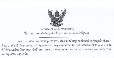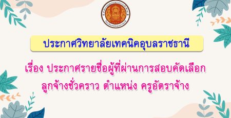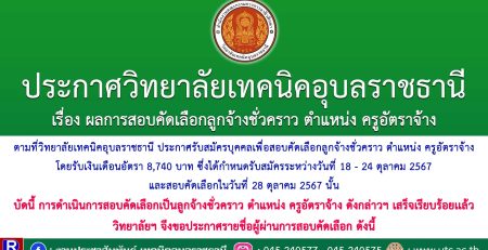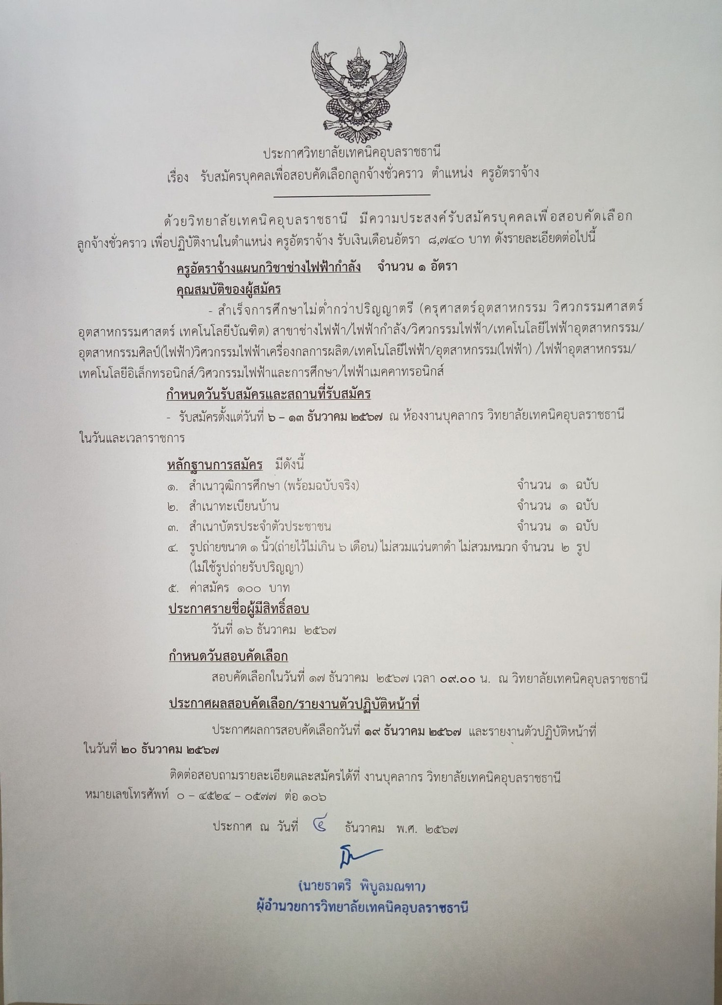 ด้วยวิทยาลัยเทคนิคอุบลราชธานี มีความประสงค์รับสมัครบุคคล เพื่อสอบคัดเลือกลูกจ้างชั่วคราว เพื่อปฏิบัติงานในตำแหน่ง ครูอัตราจ้าง รับเงินเดือนอัตรา 8,740 บาท ดังรายละเอียดต่อไปนี้