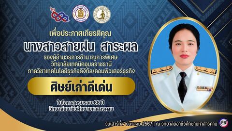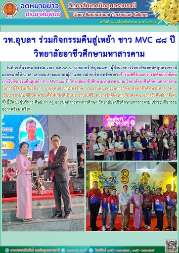 วันที่ ๗ ธันวาคม ๒๕๖๗ เวลา ๑๙.๐๐ น. นายธาตรี พิบูลมณฑา ผู้อำนวยการวิทยาลัยเทคนิคอุบลราชธานี มอบหมายให้ นางสาวสายฝน สาระผล รองผู้อำนวยการฝ่ายบริหารทรัพยากร เข้าร่วมพิธีรับมอบรางวัลศิษย์เก่าดีเด่น ภายในกิจกรรมคืนสู่เหย้า ชาว MVC ๘๘ ปี วิทยาลัยอาชีวศึกษามหาสารคาม ณ วิทยาลัยอาชีวศึกษามหาสารคาม ในการนี้ได้รับเกียรติจาก นายสุคนธ์ นาเมืองรักษ์ ประธานคณะกรรมการวิทยาลัยอาชีวศึกษามหาสารคาม เป็นประธานในพิธีเปิด พร้อมทั้งให้เกียรติเป็นประธานในพิธีมอบรางวัลศิษย์เก่าเกียรติยศ และรางวัลศิษย์เก่าดีเด่น ทั้งนี้มีคณะผู้บริหาร ศิษย์เก่า ครู และบุคลากรทางการศึกษา วิทยาลัยอาชีวศึกษามหาสารคาม เข้าร่วมกิจกรรมอย่างพร้อมเพรียง