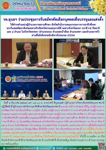 วันที่ ๙ ธันวาคม ๒๕๖๗ เวลา ๐๙.๐๐ น. นายธาตรี พิบูลมณฑา ผู้อำนวยการวิทยาลัยเทคนิคอุบลราชธานี ปฏิบัติหน้าที่ ผู้อำนวยการสำนักงานอาชีวศึกษาจังหวัดอุบลราชธานี มอบหมายให้ นายไวพจน์ ศรีธัญ รองผู้อำนวยการฝ่ายพัฒนากิจการนักเรียนนักศึกษา นายสุวิชา มั่นยืน รองผู้อำนวยการฝ่ายวิชาการ นางราตรี สะดีวงศ์ รองผู้อำนวยการฝ่ายแผนงานและความร่วมมือ และนางสาวสายฝน สาระผล รองผู้อำนวยการฝ่ายบริหารทรัพยากร เข้าร่วมการประชุมการรับสมัครคัดเลือกบุคคลเพื่อบรรจุและแต่งตั้งให้ดำรงตำแหน่งผู้อำนวยการสถานศึกษา สังกัดสำนักงานคณะกรรมการการอาชีวศึกษา ยกเว้นเขตพัฒนาพิเศษเฉพาะกิจจัดหวัดชายแดนภาคใต้ เฉพาะจังหวัดยะลา นราธิวาส ปัตตานี และ ๔ อำเภอ ในจังหวัดสงขลา (อำเภอจะนะ อำเภอสะบ้าย้อย อำเภอเทพา และอำเภอนาทวี) ผ่านสื่ออิเล็กทรอนิกส์ทางโปรแกรม ZOOM ณ ห้องศูนย์พัฒนาสื่อดิจิทัล DMDC วิทยาลัยเทคนิคอุบลราชธานี ในการนี้ได้รับเกียรติจาก นายยศพล เวณุโกเศศ เลขาธิการคณะกรรมการการอาชีวศึกษา เป็นประธานในการประชุม และมี นายณรงค์ชัย เจริญรุจิทรัพท์ รองเลขาธิการคณะกรรมการการอาชีวศึกษา ให้เกียรติเข้าร่วมการประชุมในครั้งนี้ ทั้งนี้มี นางณชิตา เถาว์โท หัวหน้าสำนักงานอาชีวศึกษาจังหวัดอุบลราชธานี นายภัทรศักดิ์ ภัทรธรรมพิบูล หัวหน้างานบุคลากร พร้อมเข้าร่วมการประชุมอย่างพร้อมเพรียง