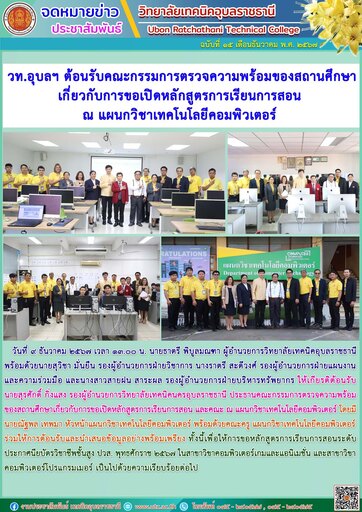วันที่ ๙ ธันวาคม ๒๕๖๗ เวลา ๑๓.๐๐ น. นายธาตรี พิบูลมณฑา ผู้อำนวยการวิทยาลัยเทคนิคอุบลราชธานี พร้อมด้วยนายสุวิชา มั่นยืน รองผู้อำนวยการฝ่ายวิชาการ นางราตรี สะดีวงศ์ รองผู้อำนวยการฝ่ายแผนงานและความร่วมมือ และนางสาวสายฝน สาระผล รองผู้อำนวยการฝ่ายบริหารทรัพยากร ให้เกียรติต้อนรับ นายสุรศักดิ์ กิ่งแสง รองผู้อำนวยการวิทยาลัยเทคนิคนครอุบลราชธานี ประธานคณะกรรมการตรวจความพร้อมของสถานศึกษาเกี่ยวกับการขอเปิดหลักสูตรการเรียนการสอน และคณะ ณ แผนกวิชาเทคโนโลยีคอมพิวเตอร์ โดยมี นายณัฐพล เทพมา หัวหน้าแผนกวิชาเทคโนโลยีคอมพิวเตอร์ พร้อมด้วยคณะครู แผนกวิชาเทคโนโลยีคอมพิวเตอร์ ร่วมให้การต้อนรับและนำเสนอข้อมูลอย่างพร้อมเพรียง ทั้งนี้เพื่อให้การขอหลักสูตรการเรียนการสอนระดับประกาศนียบัตรวิชาชีพชั้นสูง ปวส. พุทธศักราช ๒๕๖๗ ในสาขาวิขาคอมพิวเตอร์เกมและแอนิเมชั่น และสาขาวิขาคอมพิวเตอร์โปรแกรมเมอร์ เป็นไปด้วยความเรียบร้อยต่อไป