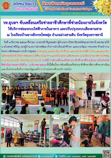 วันที่ ๗ ธันวาคม ๒๕๖๗ ที่ผ่านมา นายธาตรี พิบูลมณฑา ผู้อำนวยการวิทยาลัยเทคนิคอุบลราชธานี มอบหมายให้ นายไวพจน์ ศรีธัญ รองผู้อำนวยการฝ่ายพัฒนากิจการนักเรียนนักศึกษา และนายวัฒนา ทองเทพ หัวหน้างานโครงการพิเศษและการบริการชุมชน นำคณะครู และนักเรียน นักศึกษา แผนกวิชาช่างไฟฟ้ากำลัง และแผนกวิชาอิเล็กทรอนิกส์ เข้าให้บริการซ่อมระบบไฟฟ้าภายในอาคาร และปรับปรุงระบบเสียงตามสาย ณ โรงเรียนบ้านยางสักกระโพหลุ่ม อำเภอม่วงสามสิบ จังหวัดอุบลราชธานี ภายใต้การขับเคลื่อนเครือข่ายอาชีวศึกษาพี่ช่วยน้องภายในจังหวัด ซึ่งดำเนินการระหว่างวันที่ ๗ – ๘ ธันวาคม ๒๕๖๗ ทั้งนี้เพื่อเป็นการขับเคลื่อนเครือข่ายอาชีวศึกษาเพื่อการศึกษาเท่าเทียม และเป็นไปตามข้อสั่งการของรัฐมนตรีว่าการกระทรวงศึกษาธิการต่อไป
