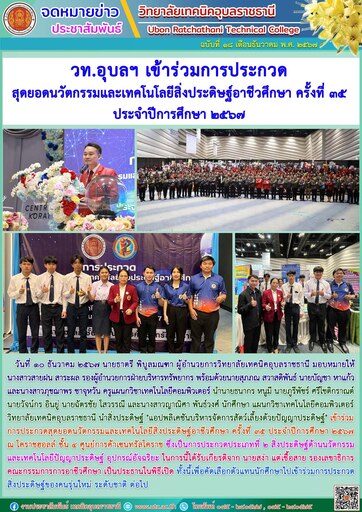วันที่ ๑๐ ธันวาคม ๒๕๖๗ นายธาตรี พิบูลมณฑา ผู้อำนวยการวิทยาลัยเทคนิคอุบลราชธานี มอบหมายให้ นางสาวสายฝน สาระผล รองผู้อำนวยการฝ่ายบริหารทรัพยากร พร้อมด้วยนายสุภภณ สวาสดิพันธ์ นายบัญชา หาแก้ว และนางสาวภุชฌาพร ชาจุหวัน ครูแผนกวิชาเทคโนโลยีคอมพิวเตอร์ นำนายธนากร หนูมี นายภูรีพัชร์ ศรีโชติกราณต์ นายวัจน์กร อินยู่ นายฉัตรชัย โสวรรณี และนางสาวญาณิศา พันธ์วงศ์ นักศึกษา แผนกวิชาเทคโนโลยีคอมพิวเตอร์ วิทยาลัยเทคนิคอุบลราชธานี นำสิ่งประดิษฐ์ “แอปพลิเคชั่นบริหารจัดการสัตว์เลี้ยงด้วยปัญญาประดิษฐ์” เข้าร่วมการประกวดสุดยอดนวัตกรรมและเทคโนโลยีสิ่งประดิษฐ์อาชีวศึกษา ครั้งที่ ๓๕ ประจำปีการศึกษา ๒๕๖๗ ณ โคราชฮอลล์ ชั้น ๔ ศูนย์การค้าเซนทรัลโคราช ซึ่งเป็นการประกวดประเภทที่ ๒ สิ่งประดิษฐ์ด้านนวัตกรรมและเทคโนโลยีปัญญาประดิษฐ์ อุปกรณ์อัจฉริยะ ในการนี้ได้รับเกียรติจาก นายสง่า แต่เชื้อสาย รองเลขาธิการคณะกรรมการการอาชีวศึกษา เป็นประธานในพิธีเปิด ทั้งนี้เพื่อคัดเลือกตัวแทนนักศึกษาไปเข้าร่วมการประกวดสิ่งประดิษฐ์ของคนรุ่นใหม่ ระดับชาติ ต่อไป