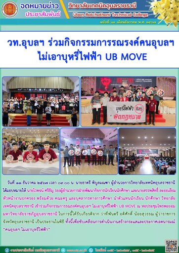 วันที่ ๑๑ ธันวาคม ๒๕๖๗ เวลา ๐๙.๐๐ น. นายธาตรี พิบูลมณฑา ผู้อำนวยการวิทยาลัยเทคนิคอุบลราชธานีได้มอบหมายให้ นายไวพจน์ ศรีธัญ รองผู้อำนวยการฝ่ายพัฒนากิจการนักเรียนนักศึกษา และนายสรรพสิทธิ์ ละออเอี่ยม หัวหน้างานปกครอง พร้อมด้วย คณะครู และบุคลากรทางการศึกษา นำตัวแทนนักเรียน นักศึกษา วิทยาลัยเทคนิคอุบลราชธานี เข้าร่วมกิจกรรมการรณรงค์คนอุบลฯ ไม่เอาบุหรี่ไฟฟ้า UB MOVE ณ หอประชุมไพรพะยอมมหาวิทยาลัยราชภัฏอุบลราชธานี ในการนี้ได้รับเกียรติจาก ว่าที่พันตรี อดิศักดิ์ น้อยสุวรรณ ผู้ว่าราชการจังหวัดอุบลราชธานี เป็นประธานในพิธี ทั้งนี้เพื่อขับเคลื่อนการดำเนินงานสร้างกระแสและประกาศเจตนารมณ์“คนอุบลฯ ไม่เอาบุหรี่ไฟฟ้า”