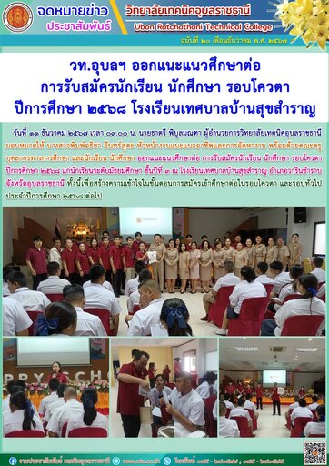 (ข่าว ปชส.วท.อบ. วันนี้) วันที่ ๑๑ ธันวาคม ๒๕๖๗ เวลา ๐๙.๐๐ น. นายธาตรี พิบูลมณฑา ผู้อำนวยการวิทยาลัยเทคนิคอุบลราชธานี มอบหมายให้ นางสาวพิมพ์อธิชา จันทร์สุตะ หัวหน้างานแนะแนวอาชีพและการจัดหางาน พร้อมด้วยคณะครู บุคลากรทางการศึกษา และนักเรียน นักศึกษา ออกแนะแนวศึกษาต่อ การรับสมัครนักเรียน นักศึกษา รอบโควตา ปีการศึกษา ๒๕๖๘ แก่นักเรียนระดับมัธยมศึกษา ชั้นปีที่ ๓ โรงเรียนเทศบาลบ้านสุขสำราญ อำเภอวารินชำราบ จังหวัดอุบลราชธานี ทั้งนี้เพื่อสร้างความเข้าใจในขั้นตอนการสมัครเข้าศึกษาต่อในรอบโควตา และรอบทั่วไป ประจำปีการศึกษา ๒๕๖๘ ต่อไป