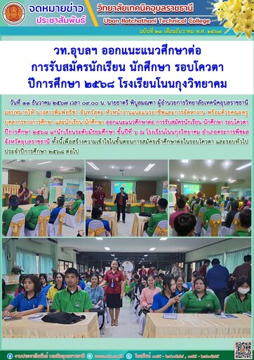 วันที่ ๑๑ ธันวาคม ๒๕๖๗ ที่ผ่านมา นายธาตรี พิบูลมณฑา ผู้อำนวยการวิทยาลัยเทคนิคอุบลราชธานี มอบหมายให้ นางสาวพิมพ์อธิชา จันทร์สุตะ หัวหน้างานแนะแนวอาชีพและการจัดหางาน พร้อมด้วยคณะครู บุคลากรทางการศึกษา และนักเรียน นักศึกษา ออกแนะแนวศึกษาต่อ การรับสมัครนักเรียน นักศึกษา รอบโควตา ปีการศึกษา ๒๕๖๘ แก่นักเรียนระดับมัธยมศึกษา ชั้นปีที่ ๖ ณ โรงเรียนโนนกุงวิทยาคม อำเภอตระการพืชผล จังหวัดอุบลราชธานี ทั้งนี้เพื่อสร้างความเข้าใจในขั้นตอนการสมัครเข้าศึกษาต่อในรอบโควตา และรอบทั่วไป ประจำปีการศึกษา ๒๕๖๘ ต่อไป
