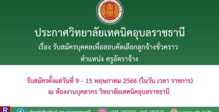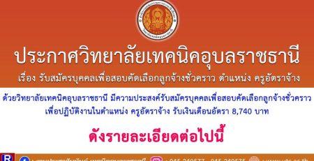 ตามที่วิทยาลัยเทคนิคอุบลราชธานี ประกาศรับสมัครบุคคลเพื่อสอบคัดเลือกลูกจ้างชั่วคราว ตำแหน่ง ครูอัตราจ้าง แผนกวิชาช่างไฟฟ้ากำลัง โดยรับสมัครระหว่างวันที่ 6 – 13 ธันวาคม 2567 และกำหนดสอบในวันที่ 17 ธันวาคม 2567 นั้น