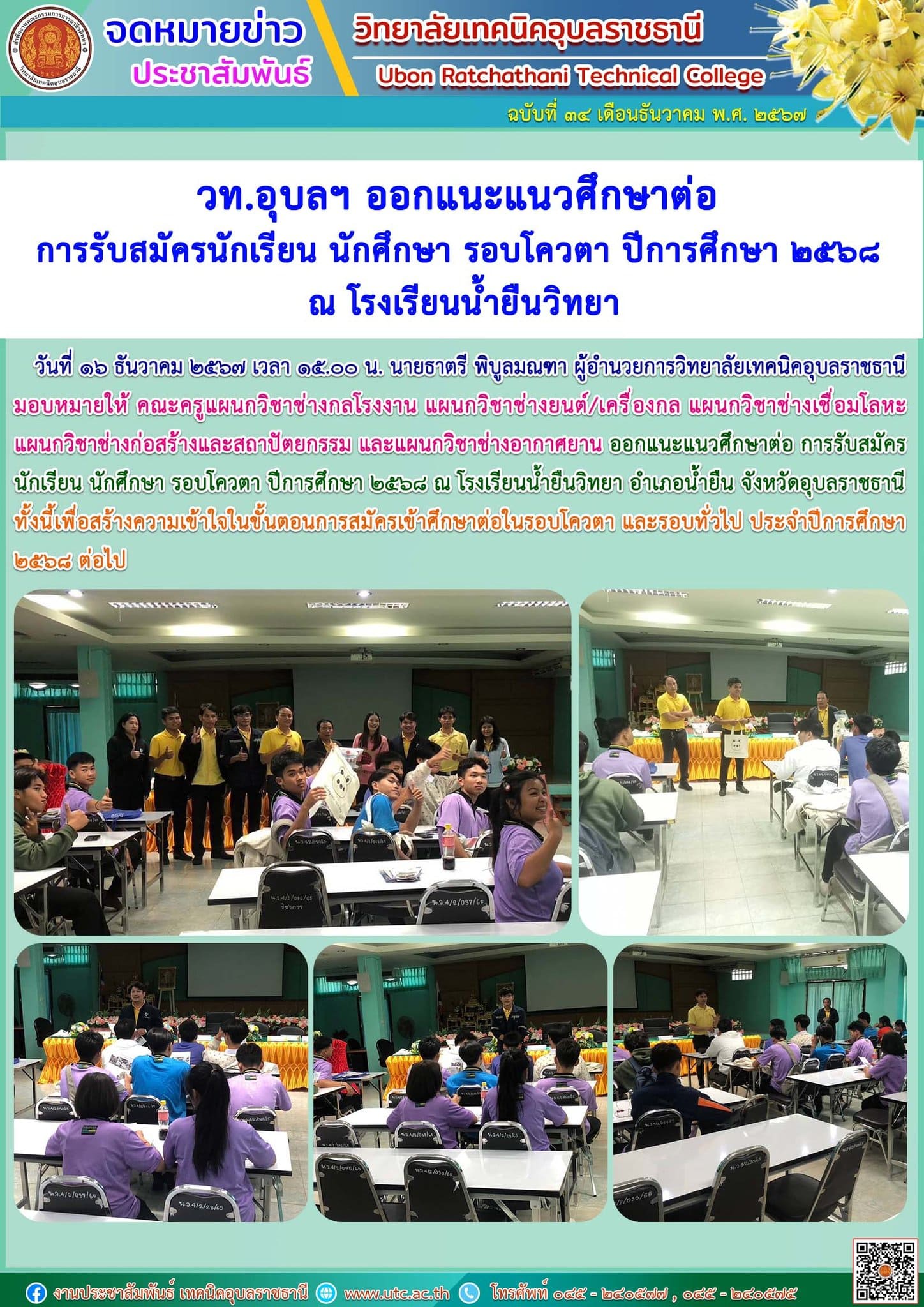 วันที่ ๑๖ ธันวาคม ๒๕๖๗ เวลา ๑๕.๐๐ น. นายธาตรี พิบูลมณฑา ผู้อำนวยการวิทยาลัยเทคนิคอุบลราชธานี มอบหมายให้ คณะครูแผนกวิชาช่างกลโรงงาน แผนกวิชาช่างยนต์/เครื่องกล แผนกวิชาช่างเชื่อมโลหะ แผนก วิชาช่างก่อสร้างและสถาปัตยกรรม และแผนกวิชาช่างอากาศยาน ออกแนะแนวศึกษาต่อ การรับสมัครนักเรียน นักศึกษา รอบโควตา ปีการศึกษา ๒๕๖๘ ณ โรงเรียนน้ำยืนวิทยา อำเภอน้ำยืน จังหวัดอุบลราชธานี ทั้งนี้เพื่อสร้างความเข้าใจในขั้นตอนการสมัครเข้าศึกษาต่อในรอบโควตา และรอบทั่วไป ประจำปีการศึกษา ๒๕๖๘ ต่อไป
