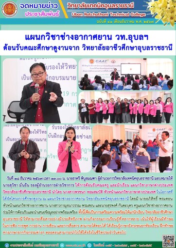 วันที่ ๑๘ ธันวาคม ๒๕๖๗ เวลา ๑๓.๐๐ น. นายธาตรี พิบูลมณฑา ผู้อำนวยการวิทยาลัยเทคนิคอุบลราชธานี มอบหมายให้ นายสุวิชา มั่นยืน รองผู้อำนวยการฝ่ายวิชาการ ให้การต้อนรับคณะครู และนักเรียน แผนกวิชาภาษาต่างประเทศ วิทยาลัยอาชีวศึกษาอุบลราชธานี นำโดย นางสาวพรชนก หอมสมบัติ หัวหน้าแผนกวิชาภาษาต่างประเทศ ในโอกาสที่ได้จัดโครงการศึกษาดูงาน ณ แผนกวิชาช่างอากาศยาน วิทยาลัยเทคนิคอุบลราชธานี โดยมี นายอภิสิทธิ์ พรมดอน หัวหน้าแผนกวิชาช่างอากาศยาน นางสาวกาญจนาวรรณ พรมสอน และนายสุรพงศ์ กันตะบุตร ครูแผนกวิชาช่างอากาศยาน ร่วมให้การต้อนรับและนำเสนอข้อมูลอย่างพร้อมเพรียง ทั้งนี้เพื่อเป็นการเตรียมความพร้อมให้แก่นักเรียน วิทยาลัยอาชีวศึกษาอุบลราชธานี ให้สามารถสื่อสารอย่างมีประสิทธิภาพ ผ่านกิจกรรมการเรียนรู้ที่หลากหลาย เน้นให้ผู้เรียนมีทักษะในการฟัง การพูด การอ่าน การเขียน และการสื่อสาร สามารถโต้ตอบได้ ได้เรียนรู้ภาษาอังกฤษนอกห้องเรียน ฝึกทักษะทางภาษาจากกิจกรรมต่างๆ ตลอดจนสามารถนำไปใช้ได้จริงในชีวิตประจำวันต่อไป