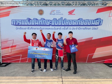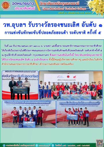 วันที่ ๑๙ ธันวาคม ๒๕๖๗ เวลา ๑๗.๐๐ น. นายสง่า แต่เชื้อสาย รองเลขาธิการคณะกรรมการการอาชีวศึกษาให้เกียรติเป็นประธานในพิธีประกาศผลและมอบรางวัลการแข่งขันทักษะขับขี่ปลอดภัยฮอนด้า ระดับชาติ ครั้งที่ ๕ ณ ศูนย์ฝึกขับขี่ปลอดภัยฮอนด้า กรุงเทพมหานคร ซึ่งผลการแข่งขันในครั้งนี้ วิทยาลัยเทคนิคอุบลราชธานี ได้รับรางวัลรองชนะเลิศ อันดับ ๑ รุ่นนักเรียนชาย ทั้งนี้มีคณะผู้บริหารสถานศึกษา ครู และนักเรียน ในสังกัดสำนักงานคณะกรรมการการอาชีวศึกษา เข้าร่วมการแข่งขันอย่างพร้อมเพรียง