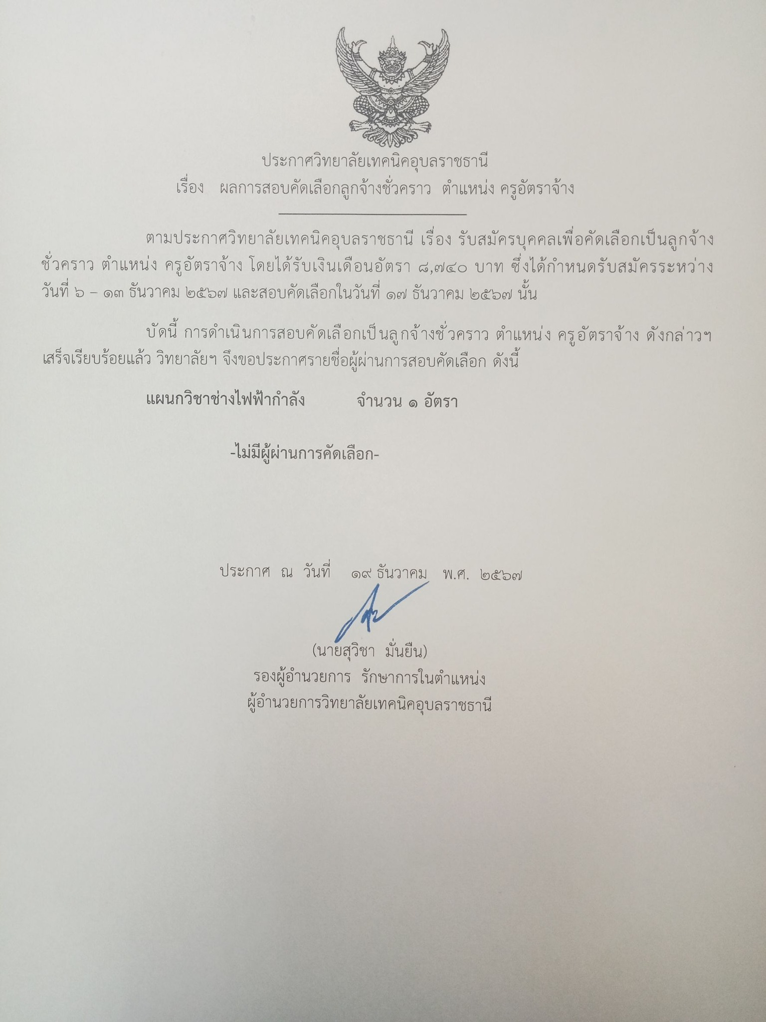 ผลการสอบคัดเลือกลูกจ้างชั่วคราว ตำแหน่ง ครูอัตราจ้าง ตามที่วิทยาลัยเทคนิคอุบลราชธานี ประกาศรับสมัครบุคคลเพื่อสอบคัดเลือกลูกจ้าง