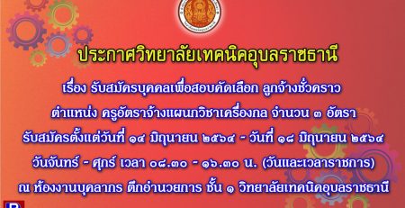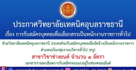 ตามที่วิทยาลัยเทคนิคอุบลราชธานี ประกาศรับสมัครบุคคลเพื่อสอบคัดเลือกลูกจ้างชั่วคราว ตำแหน่ง ครูอัตราจ้าง โดยรับเงินเดือนอัตรา 8,740 บาท ซึ่งได้กำหนดรับสมัครระหว่างวันที่ 6 – 13 ธันวาคม 2567 และสอบคัดเลือกในวันที่ 17 ธันวาคม 2567 นั้น