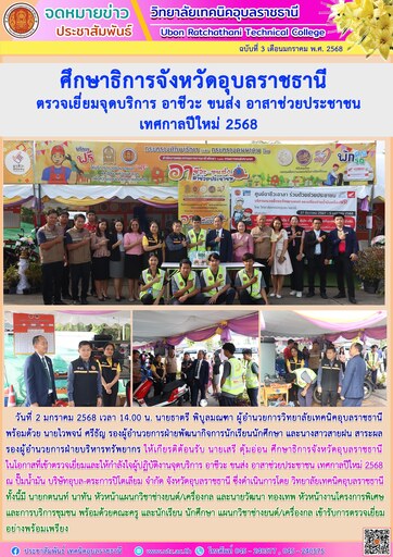 วันที่ 2 มกราคม 2568 เวลา 11.30 น. นายธาตรี พิบูลมณฑา ผู้อำนวยการวิทยาลัยเทคนิคอุบลราชธานี พร้อมด้วย นายไวพจน์ ศรีธัญ รองผู้อำนวยการฝ่ายพัฒนากิจการนักเรียนนักศึกษา และนางสาวสายฝน สาระผล รองผู้อำนวยการฝ่ายบริหารทรัพยากร ให้เกียรติต้อนรับ นายศุภศิษย์ กอเจริญยศ ผู้ตรวจราชการกระทรวงมหาดไทย นายภพ ภูสมปอง รองผู้ว่าราชการจังหวัดอุบลราชธานี นายปรีดา อุ่นอุดม นายอำเภอเมืองอุบลราชธานี และคณะ ในโอกาสที่เข้าตรวจเยี่ยมและให้กำลังใจผู้ปฏิบัติงานจุดบริการ อาชีวะ ขนส่ง อาสาช่วยประชาชน เทศกาลปีใหม่ 2568 ณ ปั๊มน้ำมัน บริษัทอุบล-ตระการปิโตเลียม จำกัด จังหวัดอุบลราชธานี ซึ่งดำเนินการโดย วิทยาลัยเทคนิคอุบลราชธานี ทั้งนี้มี นายกตนนท์ นาทัน หัวหน้าแผนกวิชาช่างยนต์/เครื่องกล และนายวัฒนา ทองเทพ หัวหน้างานโครงการพิเศษและการบริการชุมชน พร้อมด้วยคณะครู และนักเรียน นักศึกษา แผนกวิชาช่างยนต์/เครื่องกล เข้ารับการตรวจเยี่ยมอย่างพร้อมเพรียง