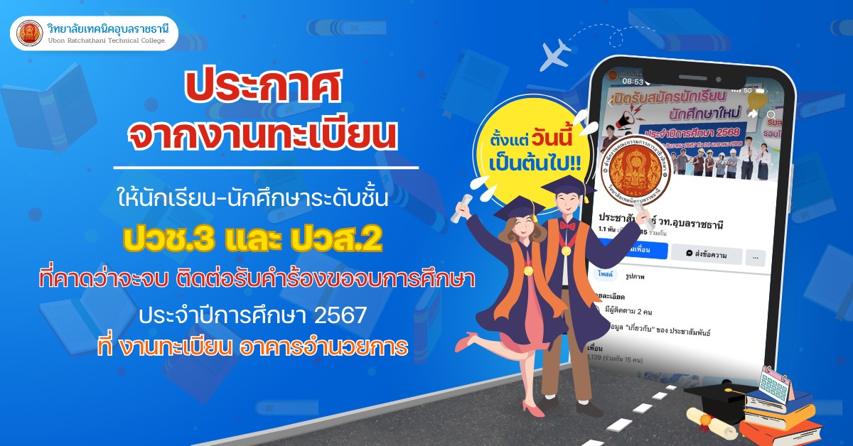 เรื่องให้นักเรียน – นักศึกษา ระดับชั้น ปวช.3 และปวส.2 ที่คาดว่าจะจบ ติดต่อรับคำร้องขอจบการศึกษา ประจำปีการศึกษา 2567 ที่งานทะเบียน อาคารอำนวยการ