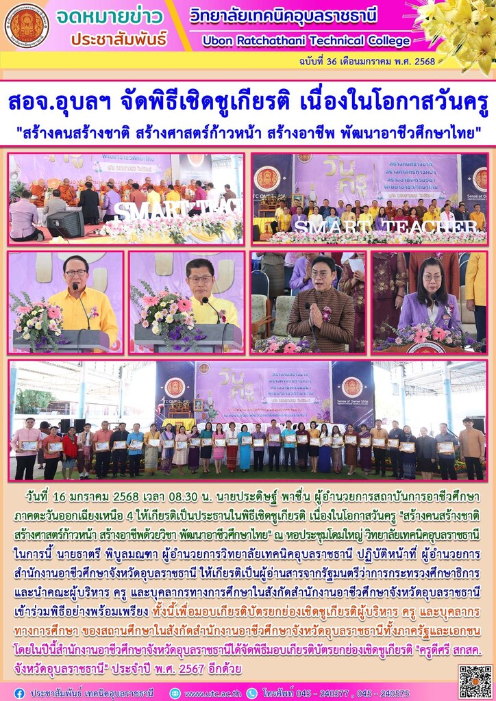 วันที่ 16 มกราคม 2568 เวลา 08.30 น. นายประดิษฐ์ พาชื่น ผู้อำนวยการสถาบันการอาชีวศึกษาภาคตะวันออกเฉียงเหนือ 4 ให้เกียรติเป็นประธานในพิธีเชิดชูเกียรติ เนื่องในโอกาสวันครู “สร้างคนสร้างชาติ สร้างศาสตร์ก้าวหน้า สร้างอาชีพด้วยวิชา พัฒนาอาชีวศึกษาไทย” ณ หอประชุมโดมใหญ่ วิทยาลัยเทคนิคอุบลราชธานี ในการนี้ นายธาตรี พิบูลมณฑา ผู้อำนวยการวิทยาลัยเทคนิคอุบลราชธานี ปฏิบัติหน้าที่ ผู้อำนวยการสำนักงานอาชีวศึกษาจังหวัดอุบลราชธานี ให้เกียรติเป็นผู้อ่านสารจากรัฐมนตรีว่าการกระทรวงศึกษาธิการ และนำคณะผู้บริหาร ครู และบุคลากรทางการศึกษาในสังกัดสำนักงานอาชีวศึกษาจังหวัดอุบลราชธานี เข้าร่วมพิธีอย่างพร้อมเพรียง ทั้งนี้เพื่อมอบเกียรติบัตรยกย่องเชิดชูเกียรติผู้บริหาร ครู และบุคลากรทางการศึกษา ของสถานศึกษาในสังกัดสำนักงานอาชีวศึกษาจังหวัดอุบลราชธานีทั้งภาครัฐและเอกชน โดยในปีนี้สำนักงานอาชีวศึกษาจังหวัดอุบลราชธานีได้จัดพิธีมอบเกียรติบัตรยกย่องเชิดชูเกียรติ “ครูดีศรี สกสค.จังหวัดอุบลราชธานี” ประจำปี พ.ศ. 2567 อีกด้วย