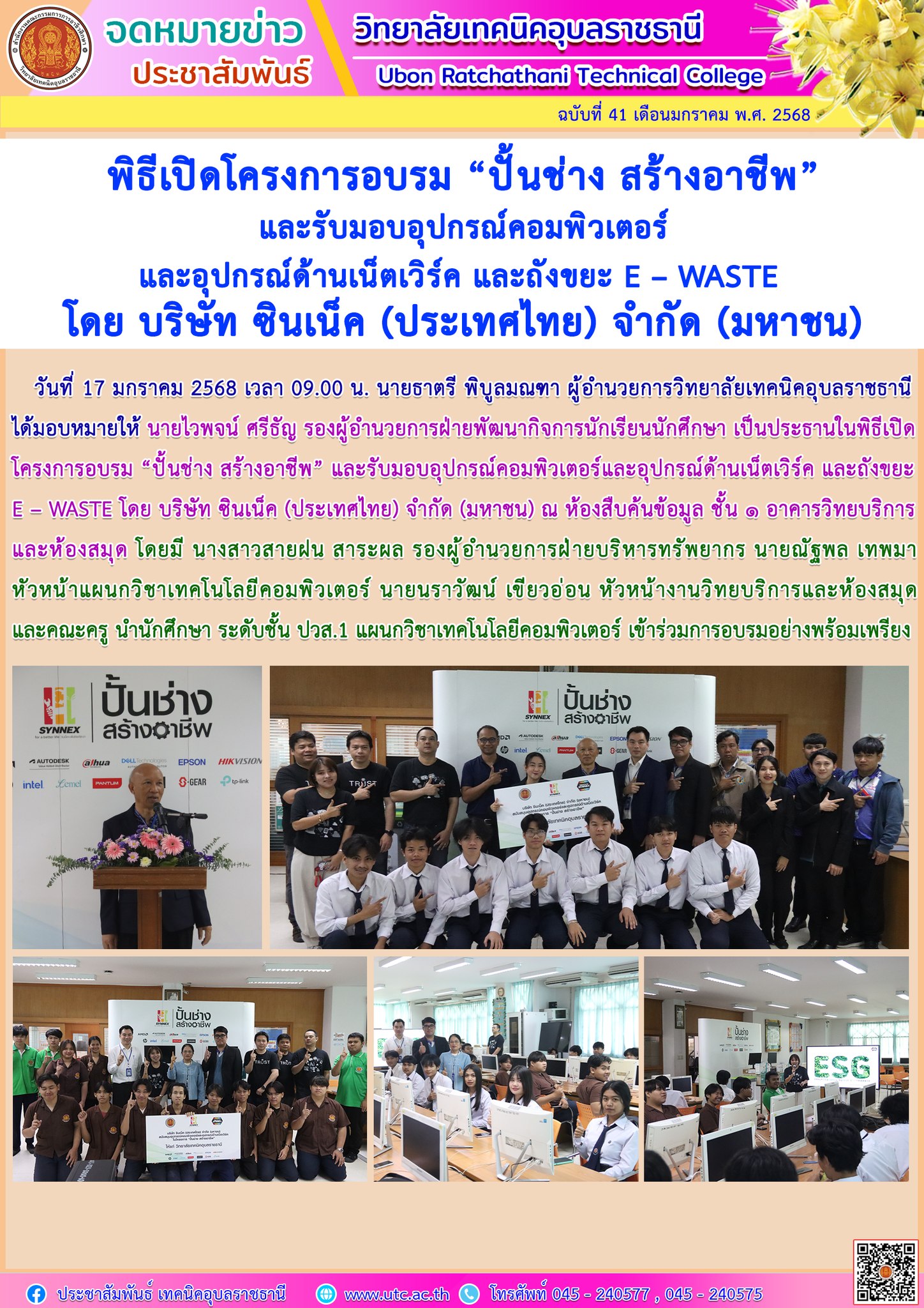 วันที่ 17 มกราคม 2568 เวลา 09.00 น. นายธาตรี พิบูลมณฑา ผู้อำนวยการวิทยาลัยเทคนิคอุบลราชธานี ได้มอบหมายให้ นายไวพจน์ ศรีธัญ รองผู้อำนวยการฝ่ายพัฒนากิจการนักเรียนนักศึกษา เป็นประธานในพิธีเปิดโครงการอบรม “ปั้นช่าง สร้างอาชีพ” และรับมอบอุปกรณ์คอมพิวเตอร์และอุปกรณ์ด้านเน็ตเวิร์ค และถังขยะE – WASTE โดย บริษัท ซินเน็ค (ประเทศไทย) จำกัด (มหาชน) ณ ห้องสืบค้นข้อมูล ชั้น ๑ อาคารวิทยบริการและห้องสมุด โดยมี นางสาวสายฝน สาระผล รองผู้อำนวยการฝ่ายบริหารทรัพยากร นายณัฐพล เทพมา หัวหน้าแผนกวิชาเทคโนโลยีคอมพิวเตอร์ นายนราวัฒน์ เขียวอ่อน หัวหน้างานวิทยบริการและห้องสมุด และคณะครู นำนักศึกษา ระดับชั้น ปวส.1 แผนกวิชาเทคโนโลยีคอมพิวเตอร์ เข้าร่วมการอบรมอย่างพร้อมเพรียง
