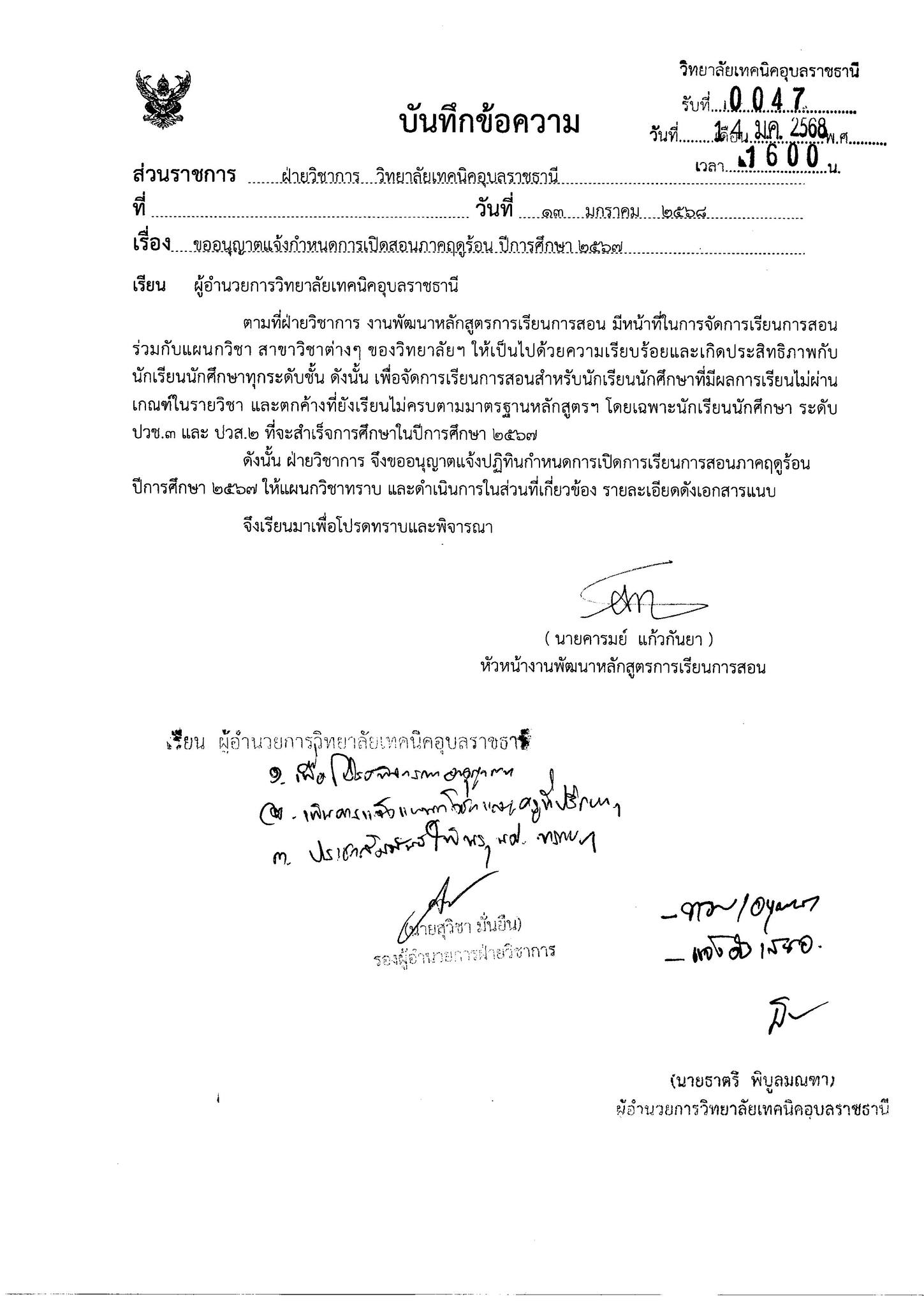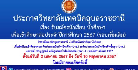 ประกาศวิทยาลัยเทคนิคอุบลราชธานี เรื่อง แจ้งกำหนดการเปิดสอนภาคฤดูร้อน ปีการศึกษา 2567