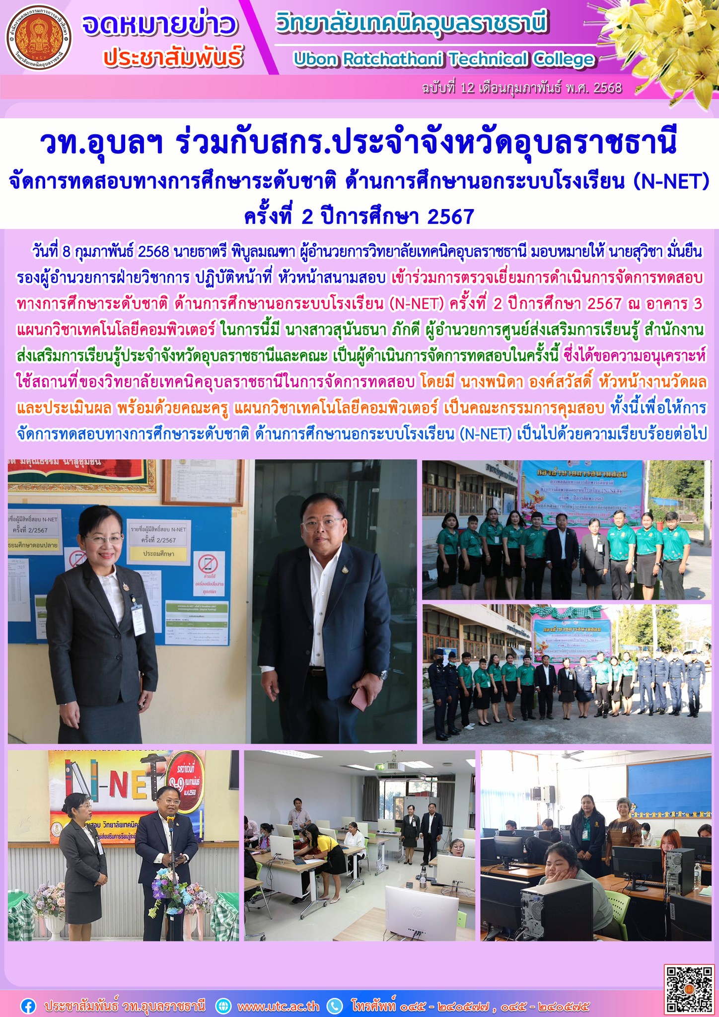 วันที่ 8 กุมภาพันธ์ 2568 นายธาตรี พิบูลมณฑา ผู้อำนวยการวิทยาลัยเทคนิคอุบลราชธานี มอบหมายให้ นายสุวิชา มั่นยืน รองผู้อำนวยการฝ่ายวิชาการ ปฏิบัติหน้าที่ หัวหน้าสนามสอบ เข้าร่วมการตรวจเยี่ยมการดำเนินการจัดการทดสอบทางการศึกษาระดับชาติ ด้านการศึกษานอกระบบโรงเรียน (N-NET) ครั้งที่ 2 ปีการศึกษา 2567 ณ อาคาร 3 แผนกวิชาเทคโนโลยีคอมพิวเตอร์ ในการนี้มี นางสาวสุนันธนา ภักดี ผู้อำนวยการศูนย์ส่งเสริมการเรียนรู้ สำนักงานส่งเสริมการเรียนรู้ประจำจังหวัดอุบลราชธานี และคณะ เป็นผู้ดำเนินการจัดการทดสอบในครั้งนี้ ซึ่งได้ขอความอนุเคราะห์ใช้สถานที่ของวิทยาลัยเทคนิคอุบลราชธานีในการจัดการทดสอบ โดยมี นางพนิดา องค์สวัสดิ์ หัวหน้างานวัดผลและประเมินผล พร้อมด้วยคณะครู แผนกวิชาเทคโนโลยีคอมพิวเตอร์ เป็นคณะกรรมการคุมสอบ ทั้งนี้เพื่อให้การจัดการทดสอบทางการศึกษาระดับชาติ ด้านการศึกษานอกระบบโรงเรียน (N-NET) เป็นไปด้วยความเรียบร้อยต่อไป