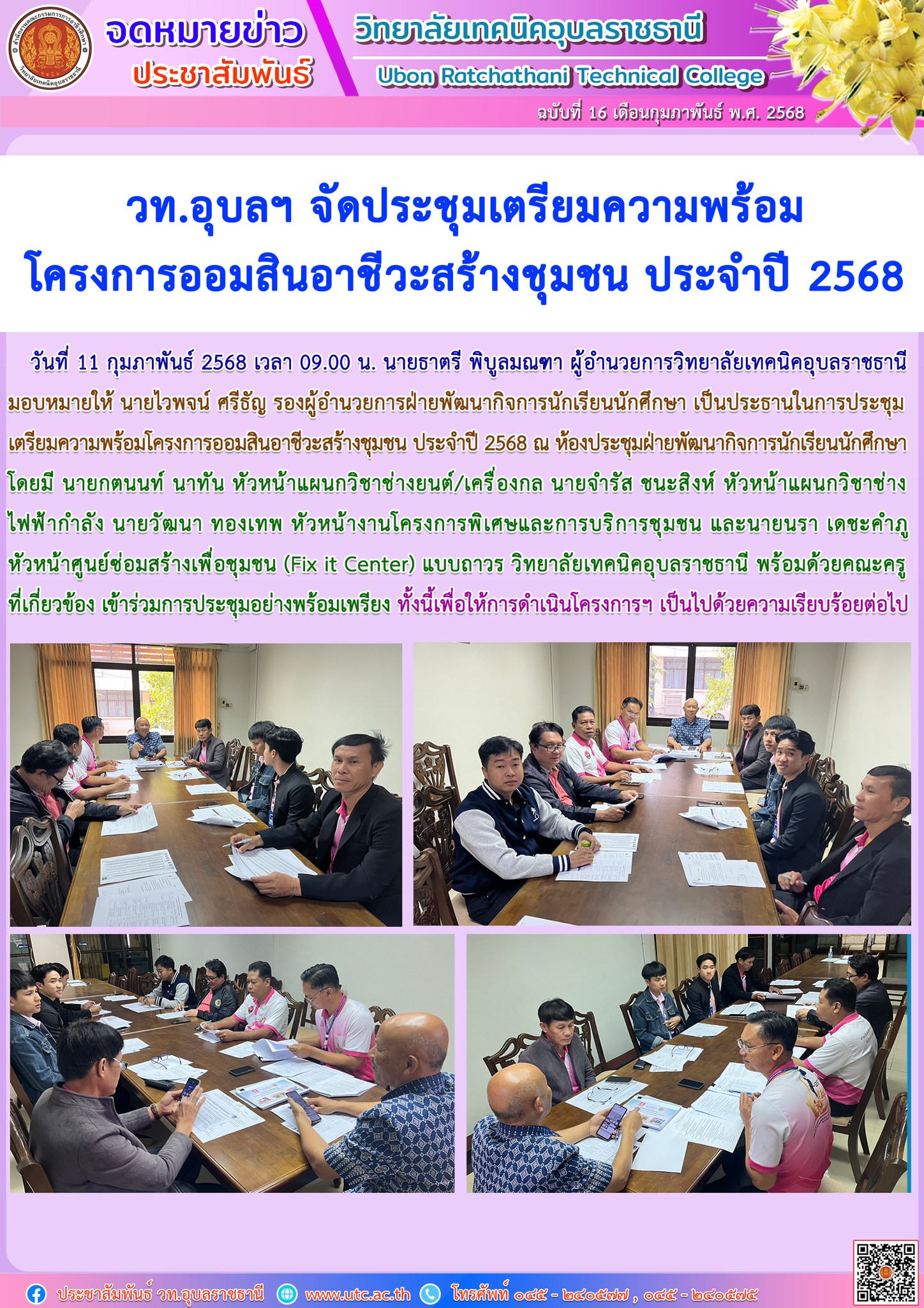 วันที่ 11 กุมภาพันธ์ 2568 เวลา 09.00 น. นายธาตรี พิบูลมณฑา ผู้อำนวยการวิทยาลัยเทคนิคอุบลราชธานีมอบหมายให้ นายไวพจน์ ศรีธัญ รองผู้อำนวยการฝ่ายพัฒนากิจการนักเรียนนักศึกษา เป็นประธานในการประชุมเตรียมความพร้อมโครงการออมสินอาชีวะสร้างชุมชน ประจำปี 2568 ณ ห้องประชุมฝ่ายพัฒนากิจการนักเรียนนักศึกษา โดยมี นายกตนนท์ นาทัน หัวหน้าแผนกวิชาช่างยนต์/เครื่องกล นายจำรัส ชนะสิงห์ หัวหน้าแผนกวิชาช่างไฟฟ้ากำลัง นายวัฒนา ทองเทพ หัวหน้างานโครงการพิเศษและการบริการชุมชน และนายนรา เดชะคำภู หัวหน้าศูนย์ซ่อมสร้างเพื่อชุมชน (Fix it Center) แบบถาวร วิทยาลัยเทคนิคอุบลราชธานี พร้อมด้วยคณะครูที่เกี่ยวข้อง เข้าร่วมการประชุมอย่างพร้อมเพรียง ทั้งนี้เพื่อให้การดำเนินโครงการฯ เป็นไปด้วยความเรียบร้อยต่อไป #เรียนดีมีความสุข