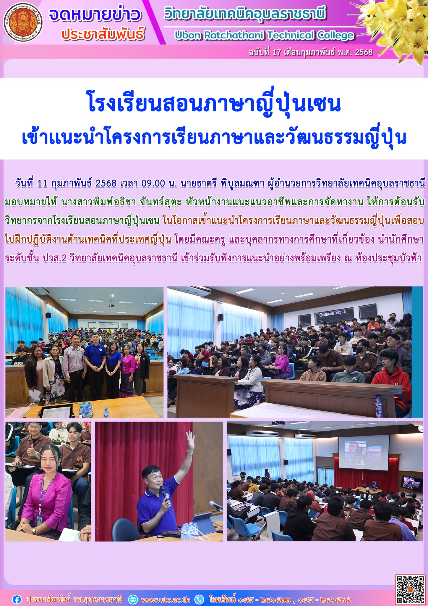 วันที่ 11 กุมภาพันธ์ 2568 เวลา 09.00 น. นายธาตรี พิบูลมณฑา ผู้อำนวยการวิทยาลัยเทคนิคอุบลราชธานี มอบหมายให้ นางสาวพิมพ์อธิชา จันทร์สุตะ หัวหน้างานแนะแนวอาชีพและการจัดหางาน ให้การต้อนรับวิทยากรจากโรงเรียนสอนภาษาญี่ปุ่นเซน ในโอกาสเข้าแนะแนวโครงการเรียนภาษาและวัฒนธรรมญี่ปุ่นเพื่อสอบไปฝึกปฏิบัติงานด้านเทคนิคที่ประเทศญี่ปุ่น โดยมีคณะครู และบุคลากรทางการศึกษาที่เกี่ยวข้อง นำนักศึกษา ระดับชั้น ปวส.2 วิทยาลัยเทคนิคอุบลราชธานี เข้าร่วมรับฟังการแนะนำอย่างพร้อมเพรียง ณ ห้องประชุมบัวฟ้า